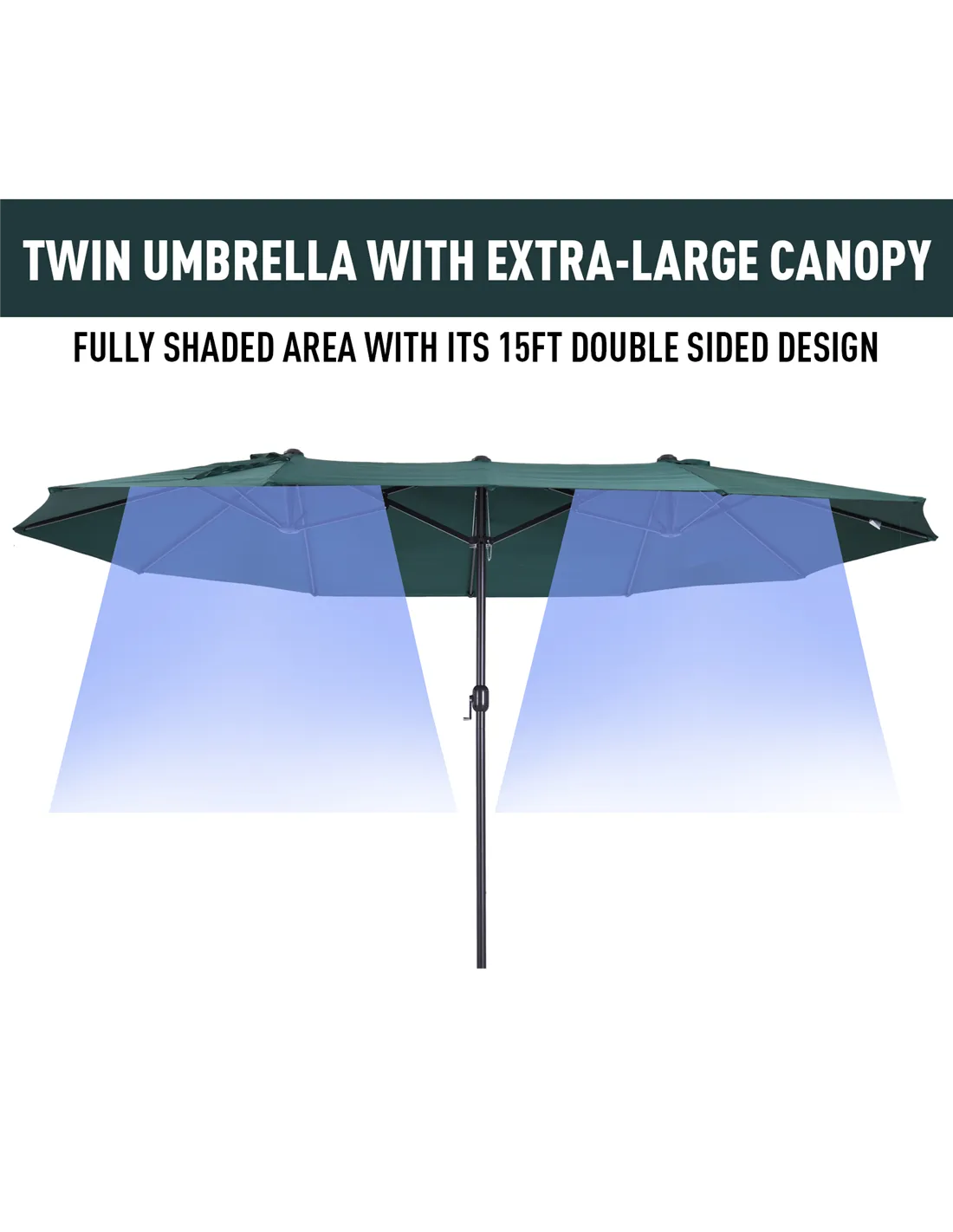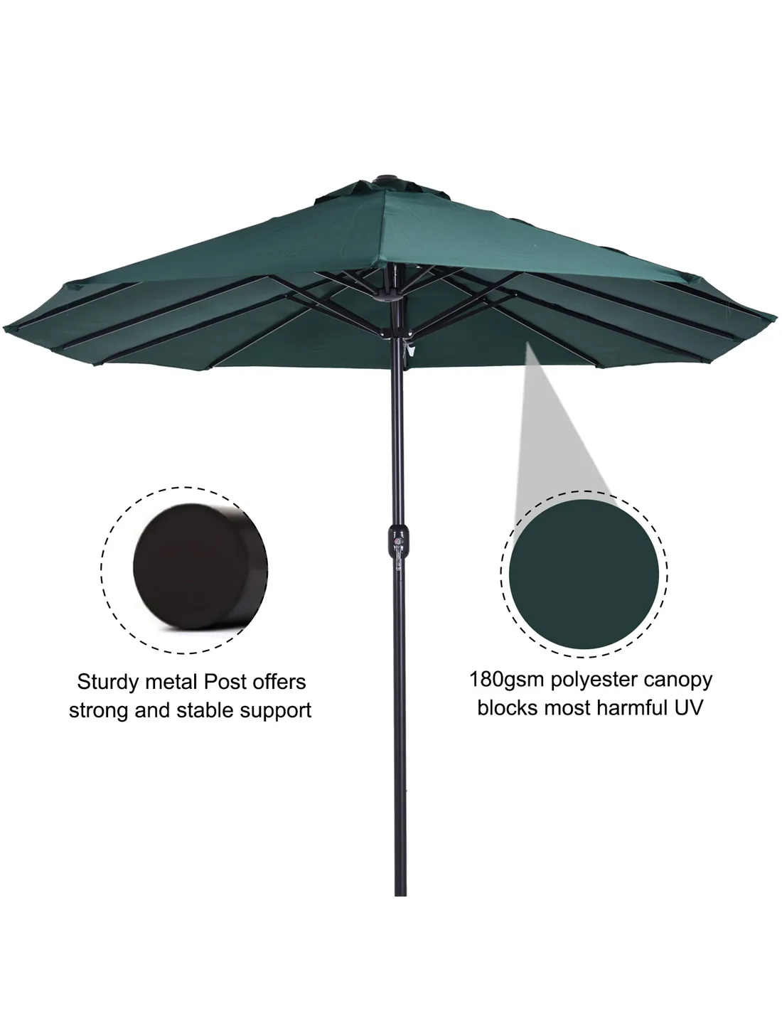 Based on reviews from UK customers, the Outsunny 4.6m Double Garden Parasol in green is praised for its robust construction and ease of use. Many highlight the smooth crank lift mechanism and the generous shade it provides, making it a favourite for summer gatherings. Users appreciate the fade-resistant fabric that maintains its vibrant colour season after season. Some note that assembly is straightforward, though the base must be purchased separately. Overall, this parasol is regarded as a reliable and stylish outdoor accessory.