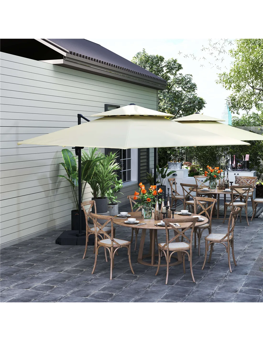 The Outsunny Roma Cantilever Umbrella is an ideal addition to any British garden, patio, or outdoor dining area, providing ample shade and UV protection throughout the day. Its 360-degree rotating canopy allows you to adjust coverage effortlessly, making it perfect for alfresco lunches, relaxing with a book, or entertaining guests. Thanks to its sturdy aluminium frame and water-resistant polyester canopy, it withstands typical UK weather conditions, offering reliable shelter from sun and light rain. The double-tier roof design promotes airflow, keeping the area beneath cool and comfortable even on warmer days. Customers often pair this parasol with outdoor furniture sets or place it beside loungers to create a stylish and practical outdoor retreat.