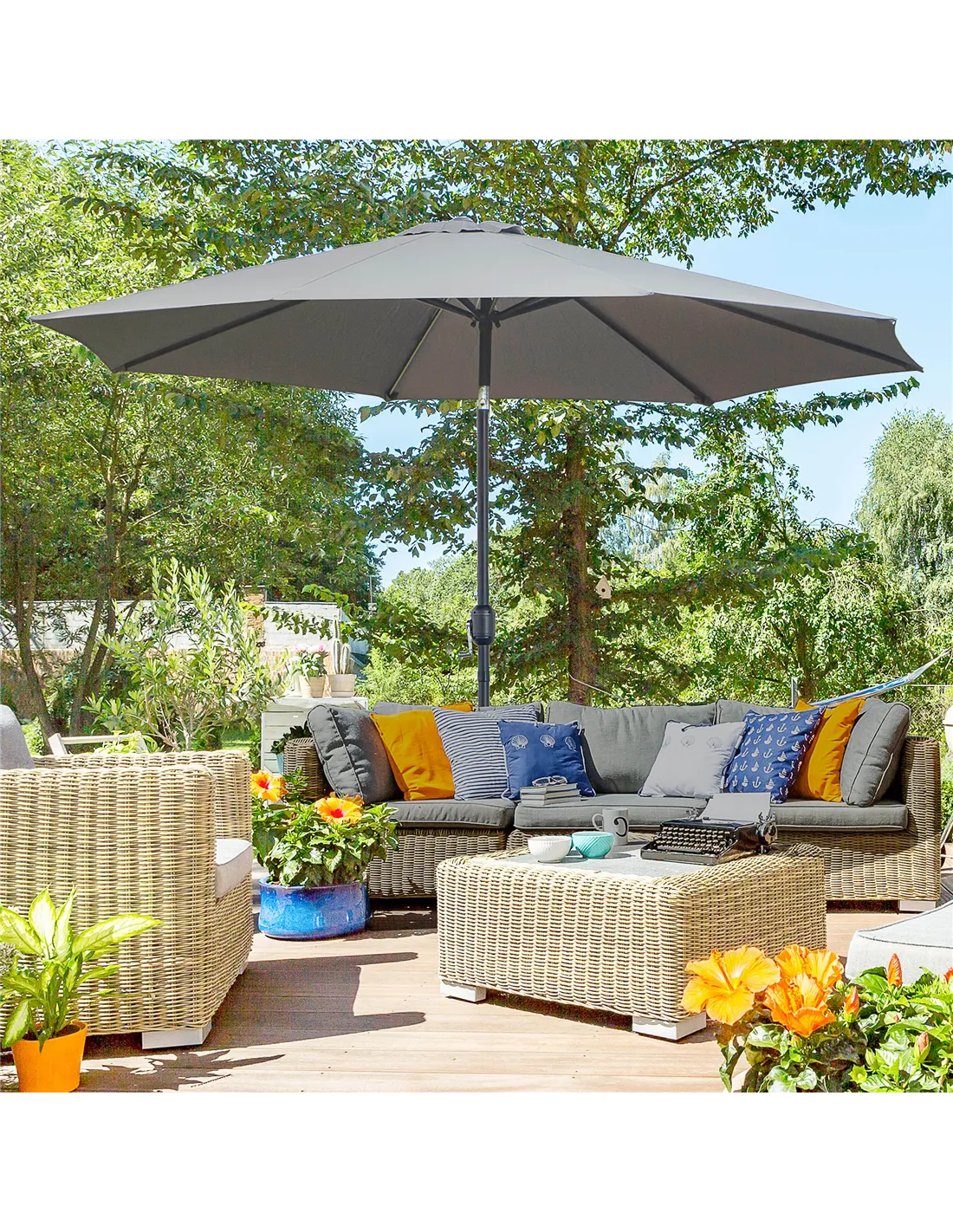 - Excellent addition to patios or poolside zones, offering adjustable sun protection thanks to the tilting canopy and crank handle.