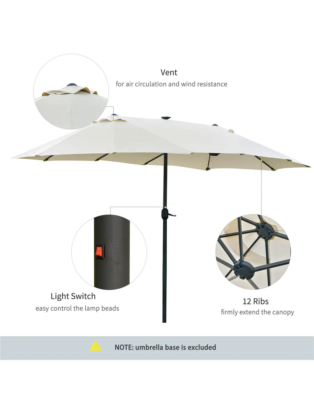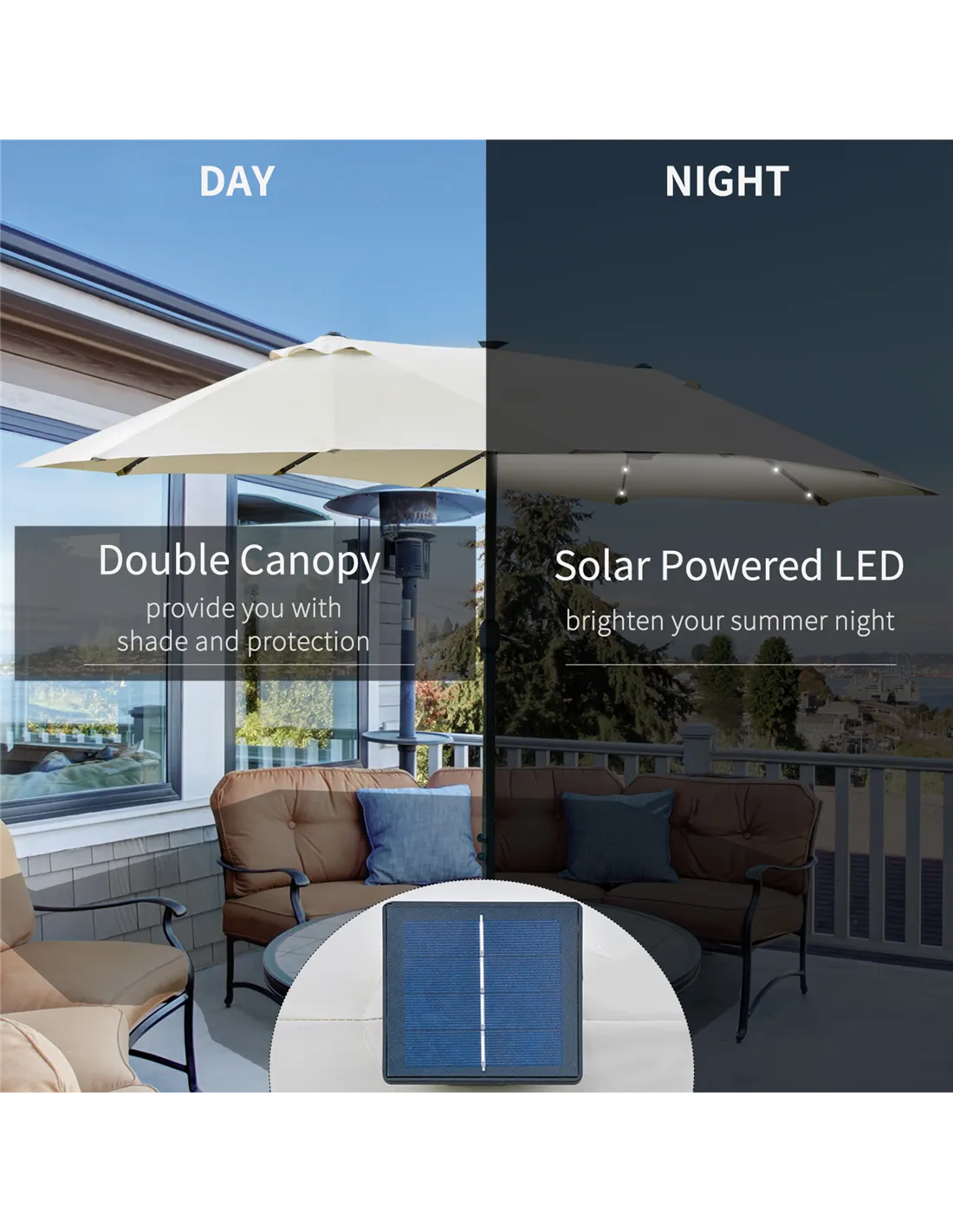 It's time for your garden to shine with this solar parasol from Outsunny. A stylish design, the sun parasol features 36 lights on the frame ribs to light up your outdoor seating when dark. The large double parasol garden creates plenty of shade, protecting you from direct sunlight. Using a crank mechanism for effortless opening and closing. If you've been searching for a new way to change your garden, then our outdoor umbrellas are the answer. Matching base: Outsunny sku 84D-089.