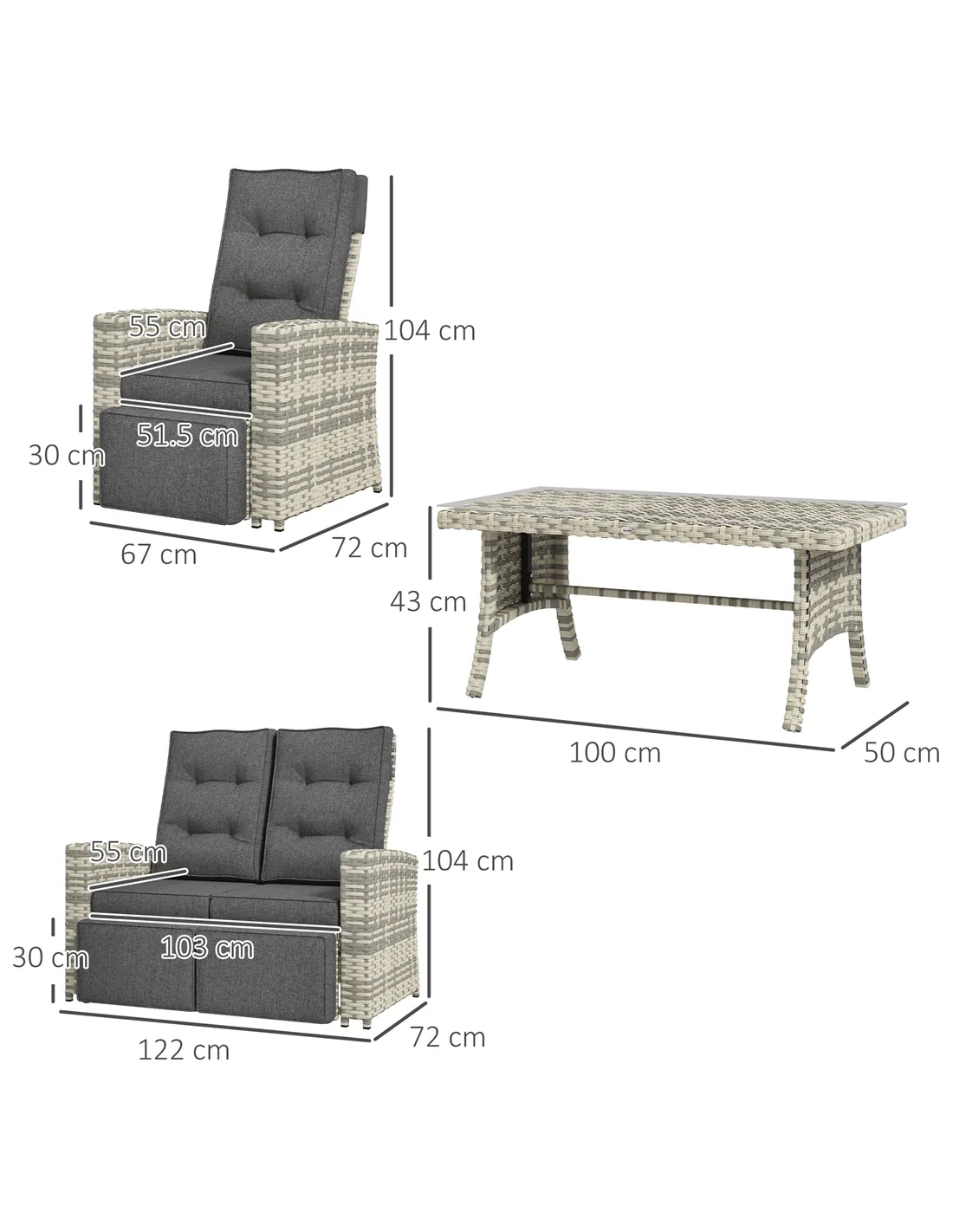 An inviting outdoors, this season and beyond: say hello to this Outsunny rattan furniture set. All pieces have a galvanised steel frame for a strong core, wrapped in plastic wicker for double the durability-and style, of course. The two armchairs have 90°-135° reclining backs-extra relaxing points scored! Seat and back cushions for comfort. Complete with a glass-top coffee table.