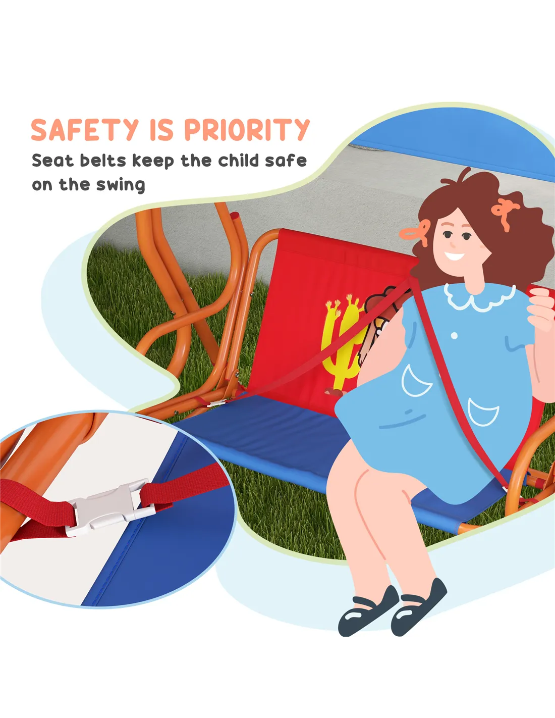 Outsunny kids swing chair and garden table set will completely transform outdoor playtime. It provides children with a fantastic spot to play games and socialise while ensuring their safety with seatbelts. The charming cowboy design adds a touch of whimsy to any outdoor space, allowing children's imaginations to soar. Crafted with a stable steel frame, this swing bench ensures durability, making it suitable for both indoor and outdoor use.