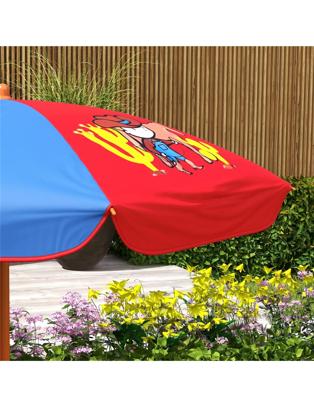 Outsunny 4 Piece Kids Garden Furniture Set with Adjustable Canopy, Cowboy Themed, Kids Garden Table and Chair Set and Double Seat Swing Chair for Patio Park Porch, for Ages 3-6 Years - Red and Blue