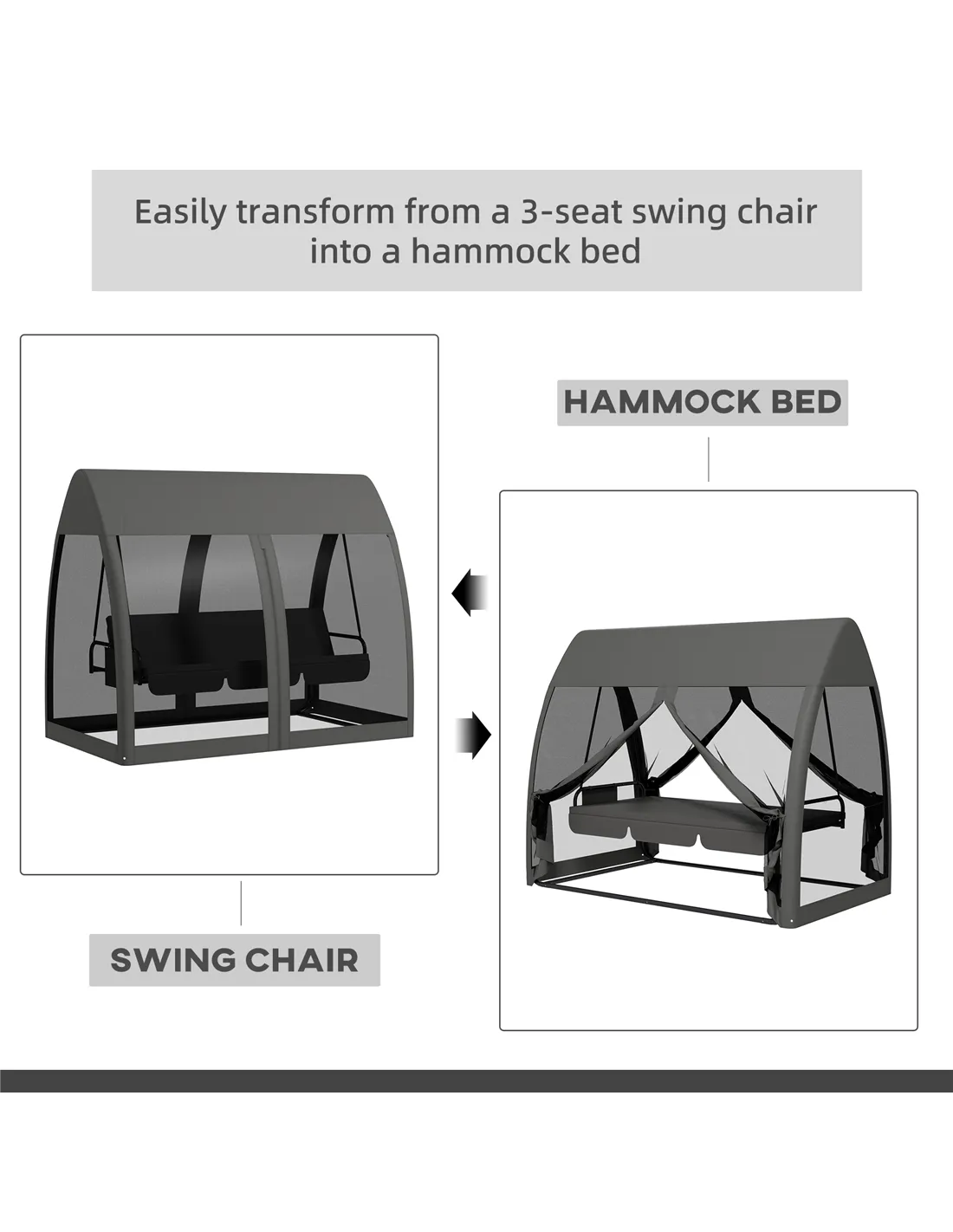 Outsunny Three-Seater Convertible Swing Chair/Bed, with Curtained Canopy - Grey