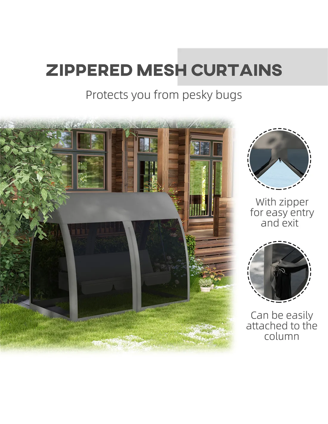 - UV-resistant canopy, with mesh sides: create a private enclosure. Zipped doors for easy access