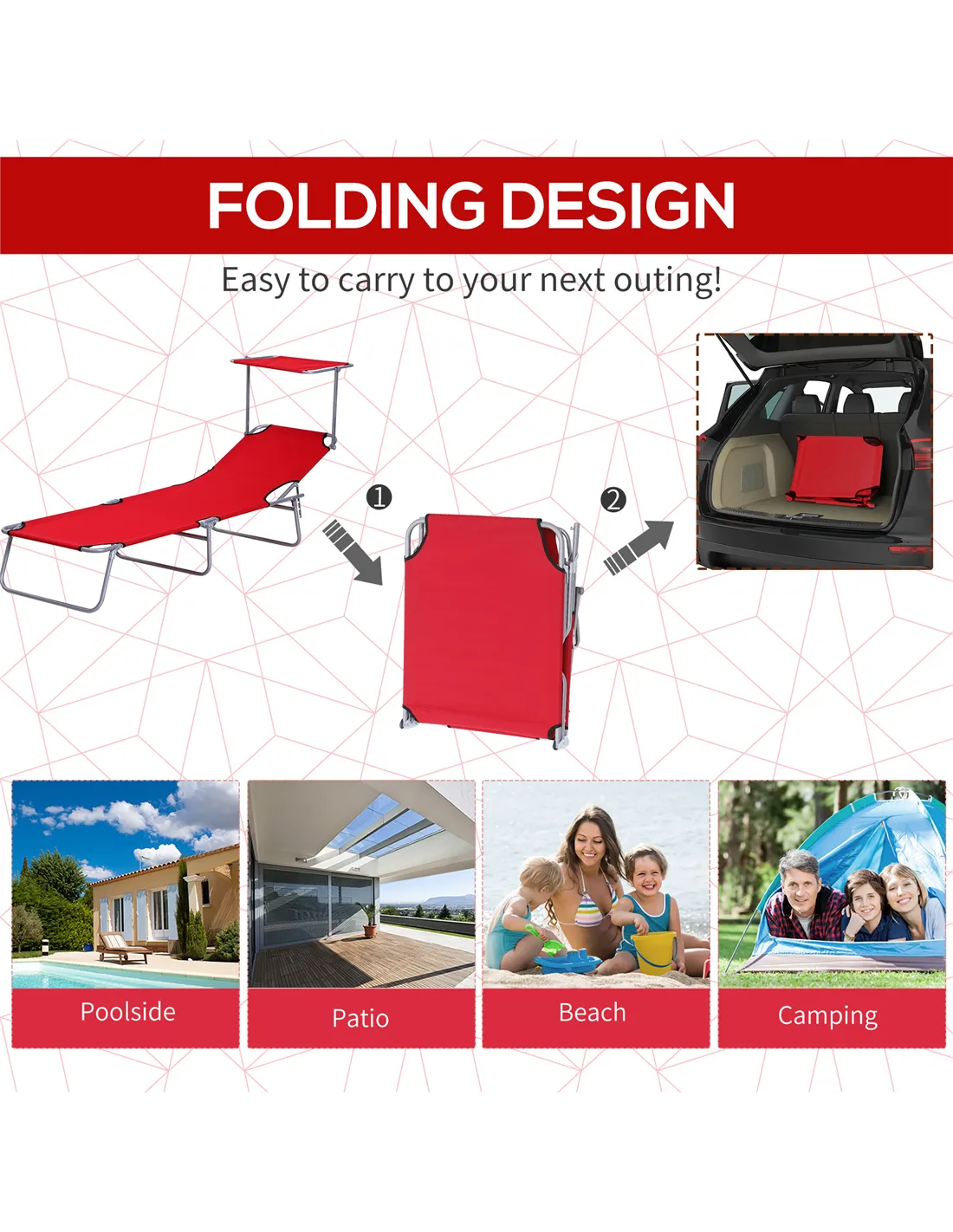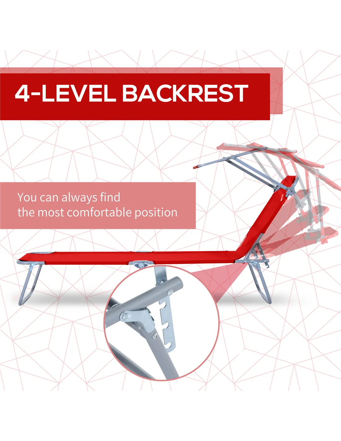 The recliner chairs in an elegant folding design and is not just for garden, balcony and pool, but is also ideal for camping and vacations. Perfect for you to take a nap during hot summer, and also ideal for enjoying outdoor sun bath on the beach, swing pool or anywhere else. The lounger back is multiple adjustable, you can adjust it to any position you like. It designed to give you maximum relaxation.