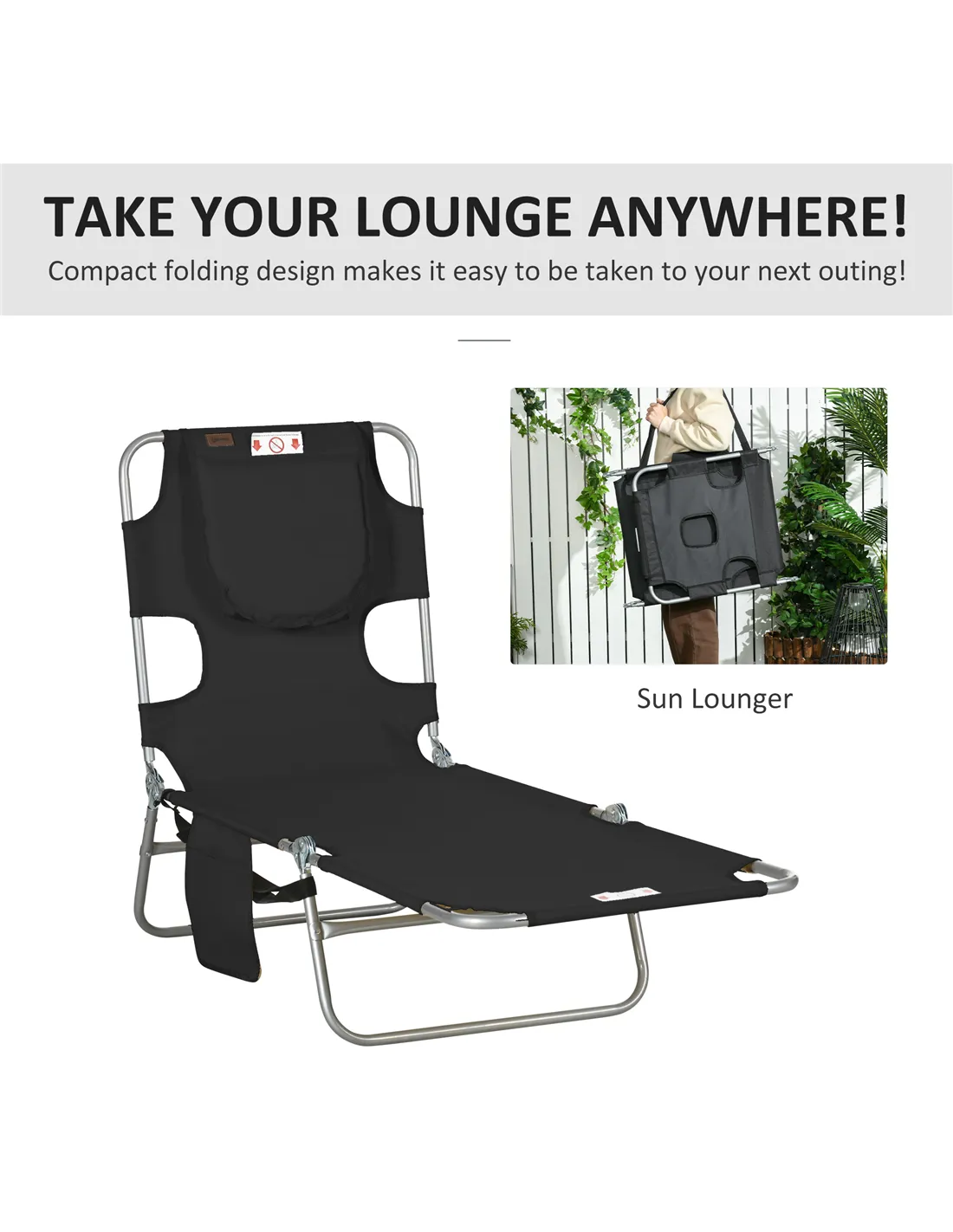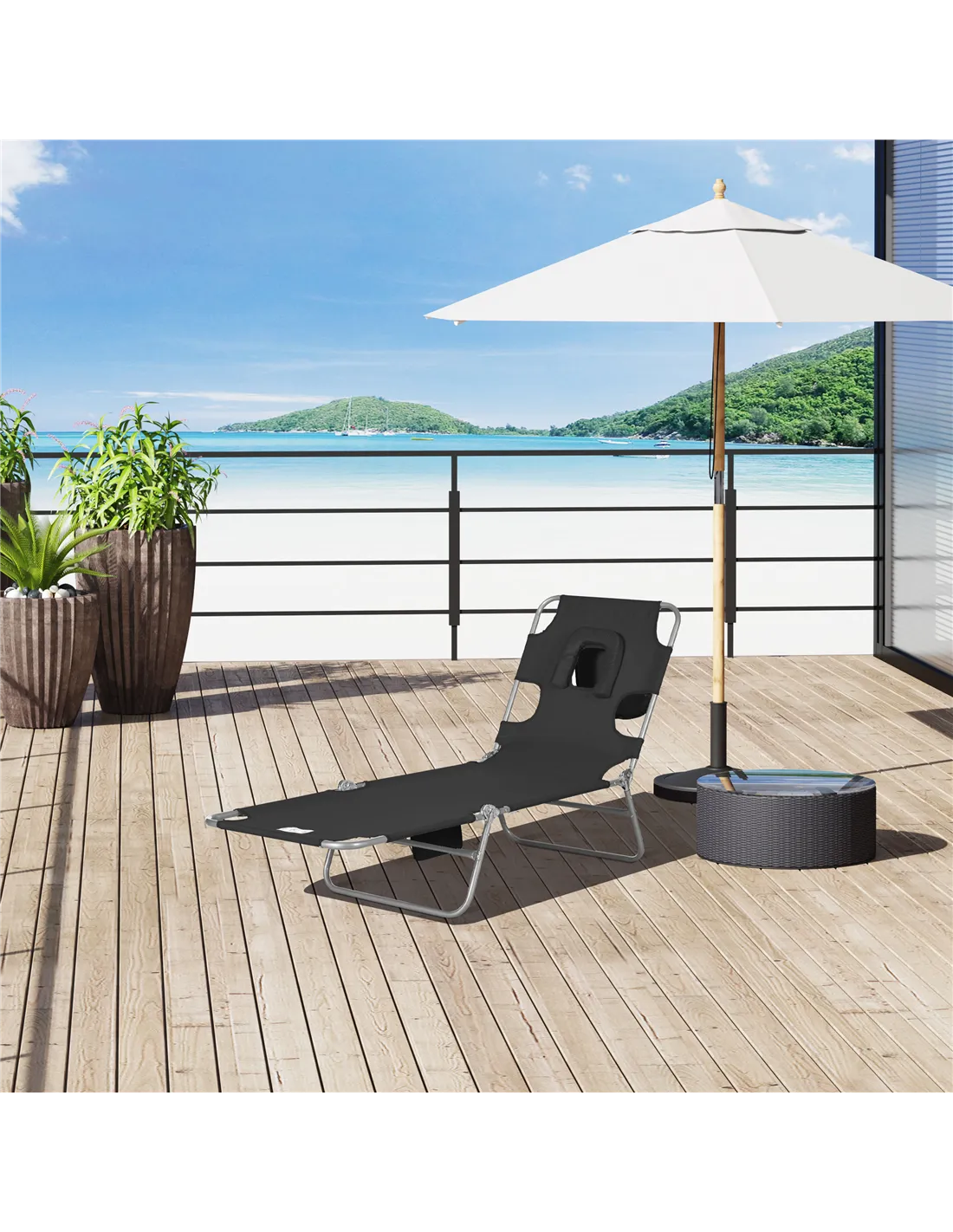 Outsunny Foldable Sun Lounger, Beach Chaise Lounge with Reading Hole, Arm Slots, 5-Position Adjustable Backrest, Side Pocket, Pillow for Garden, Beach, Pool, Black