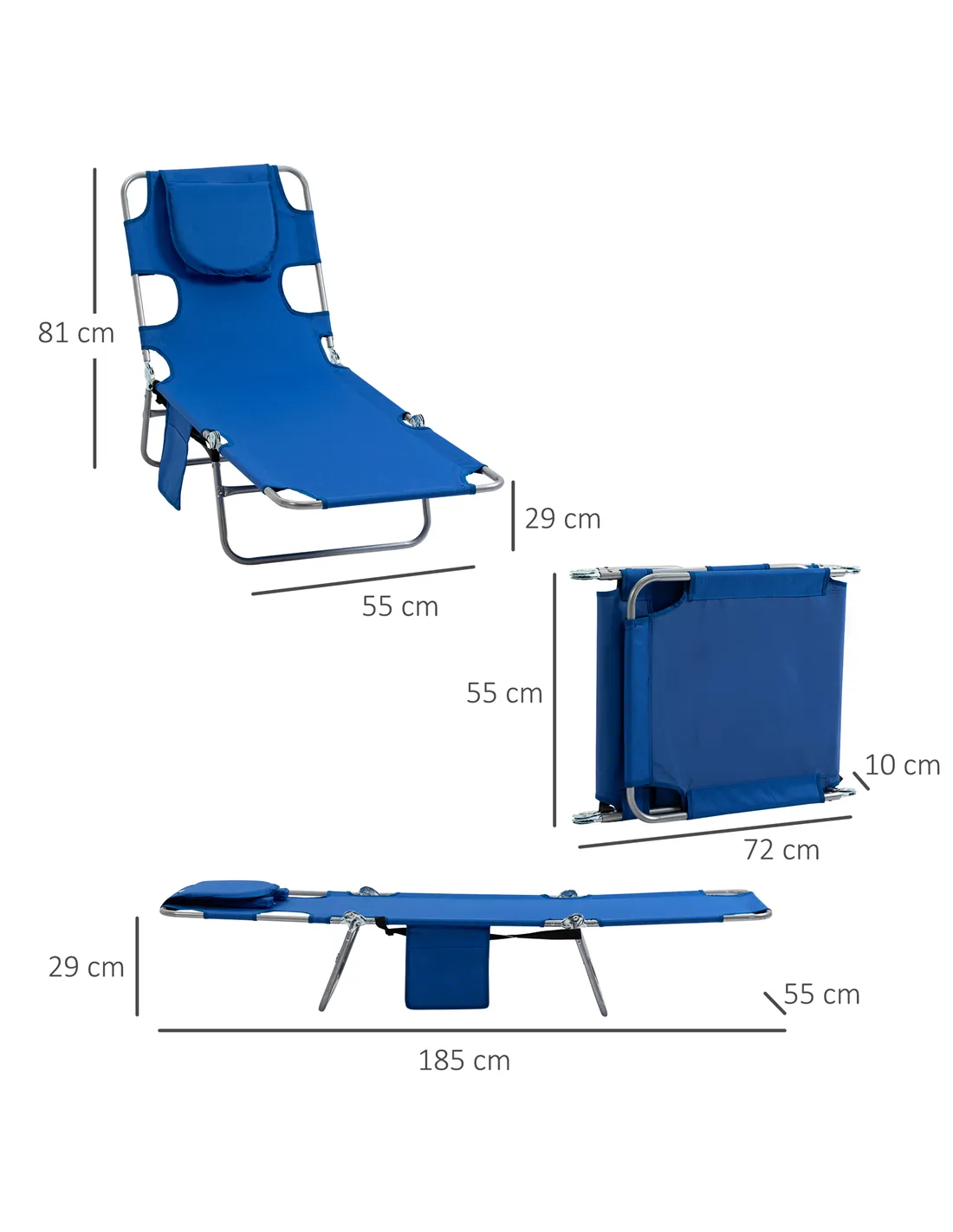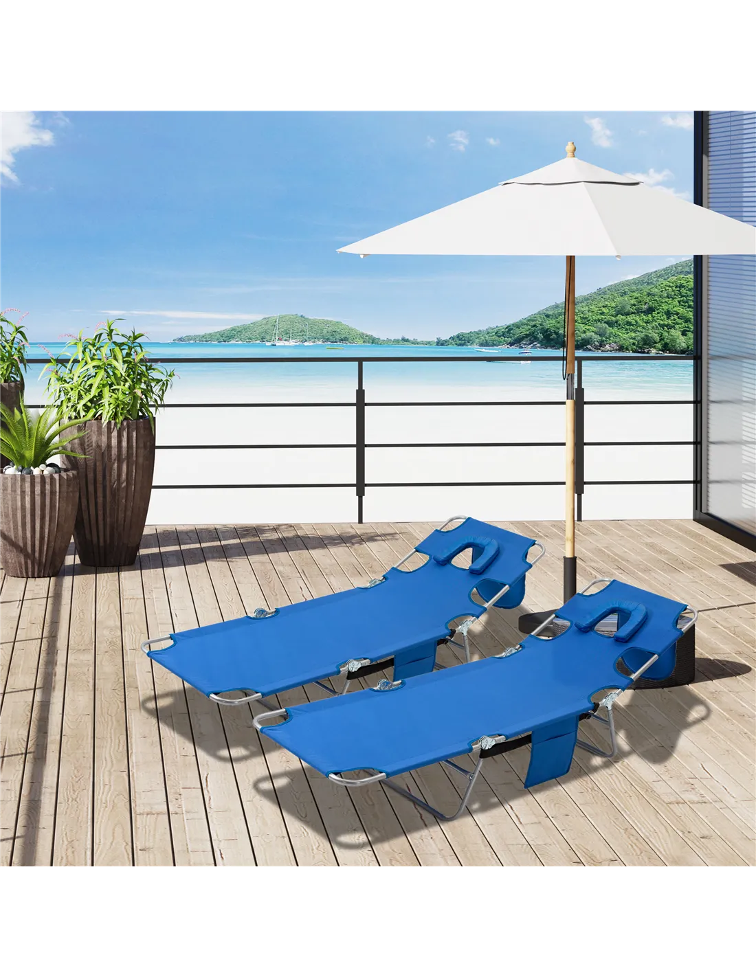 Outsunny 2 Pieces Foldable Sun Lounger with Reading Hole, Portable Sun Lounger with 5 Level Adjustable Backrest, Reclining Lounge Chair with Side Pocket, Headrest Pillow, Blue