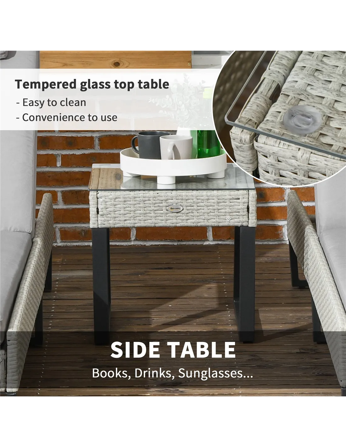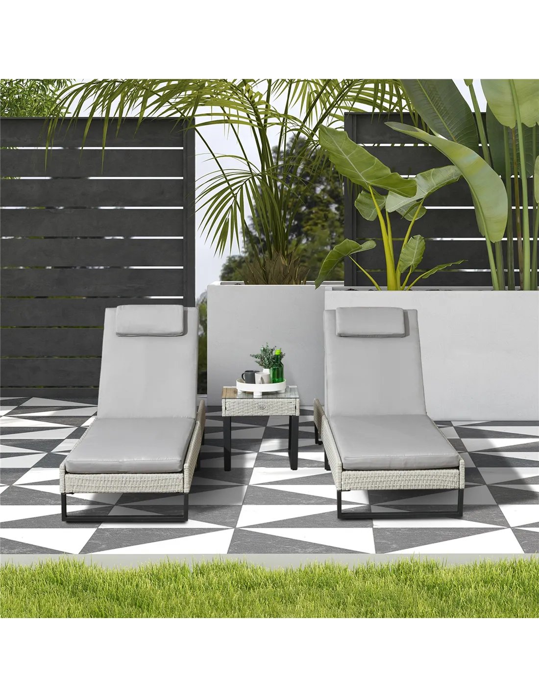 Enhance your outdoor living space with this elegant Outsunny 3-piece rattan sun lounger set, perfect for relaxing in your garden, patio, or balcony. The adjustable five-position recliners allow you to find the ideal angle for sunbathing, reading, or enjoying a refreshing drink. The accompanying glass-top coffee table provides a convenient surface for snacks, beverages, or decorative items, making it ideal for socialising with family and friends. Thanks to its durable PE rattan and steel frame construction, this set withstands the variable British weather while adding a modern touch to your outdoor décor. Cushions and headrests ensure lasting comfort during long summer afternoons or cosy evenings outdoors.