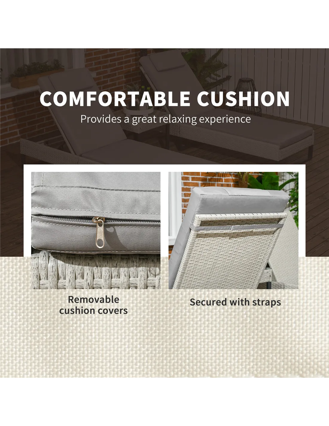 Outsunny 3-piece PE Rattan Sun Lounger Set with Adjustable 5-Position Recliner, Patio Chaise Lounge Chair Set with Cushions, Headrests, Glass Top Square Coffee Table, Light Grey