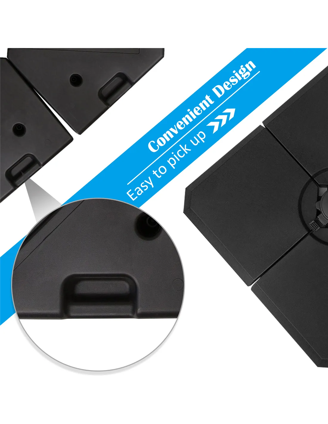 A: These bases are designed specifically for cantilever and Roma parasols, including banana and Roman styles. Please measure your parasol pole diameter to ensure compatibility. - Q: How much weight can each base hold?