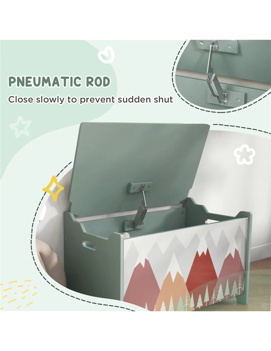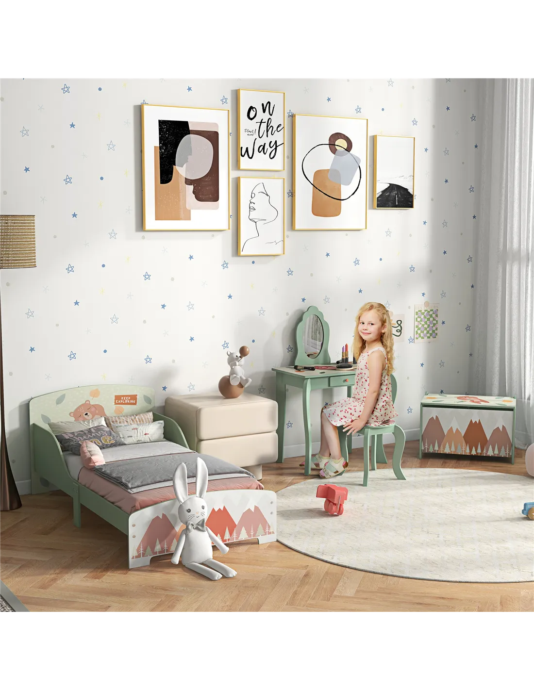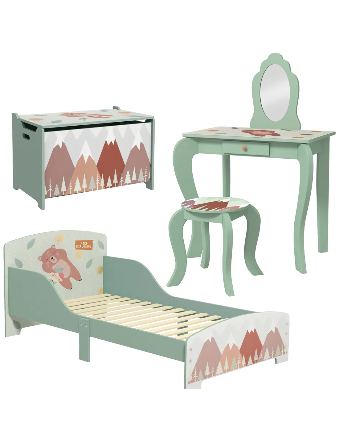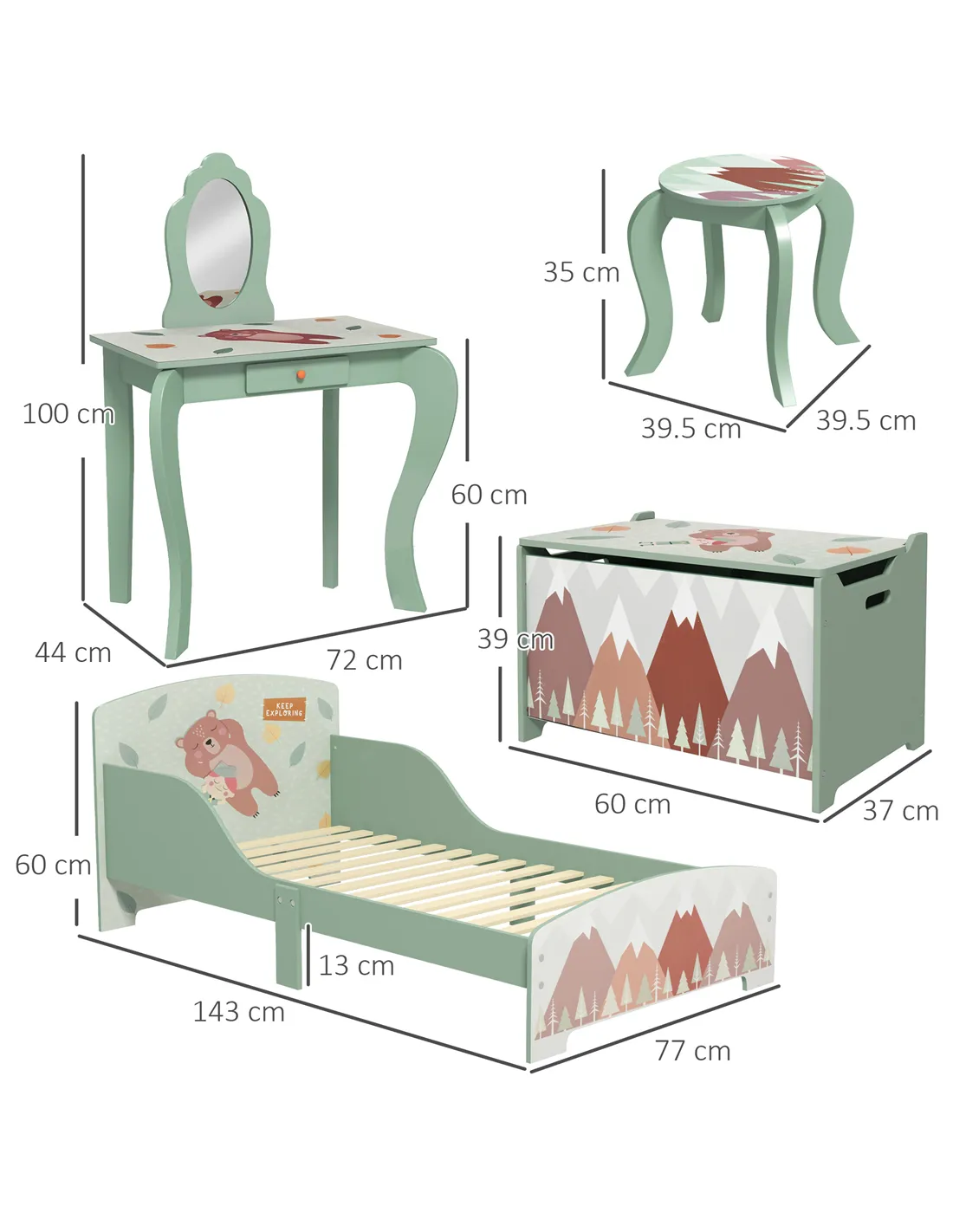 ZONEKIZ Kids Bedroom Furniture Set Includes Bed Frame, Kids Toy Chest, Dressing Table with Mirror and Stoolfor Ages 3-6 Years, Green
