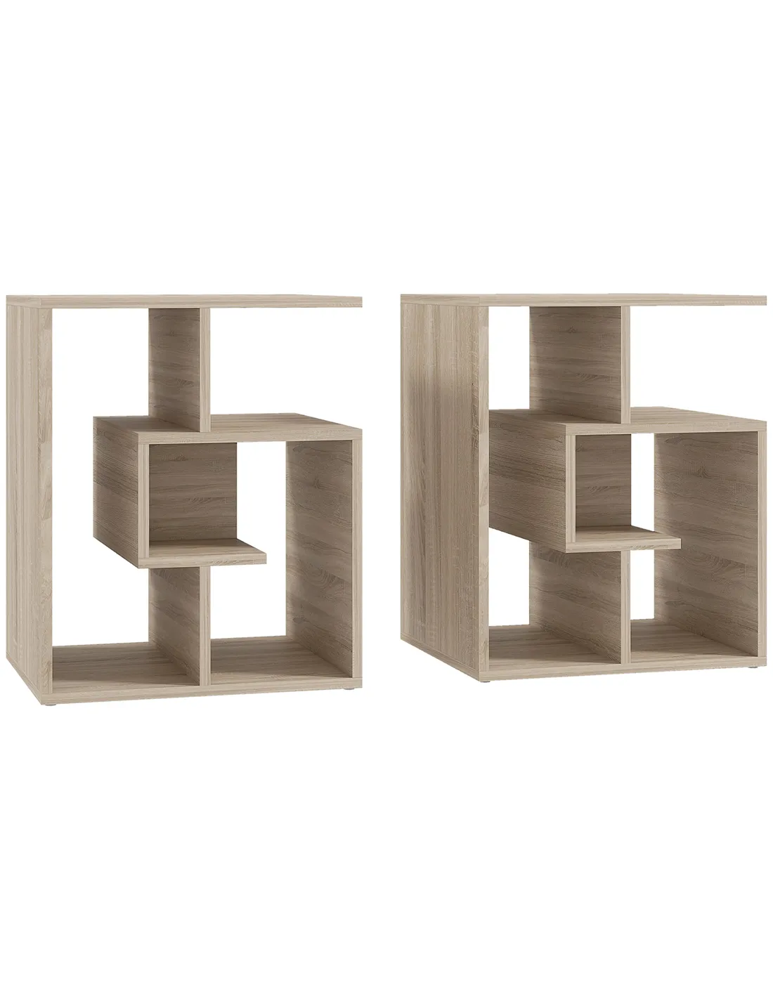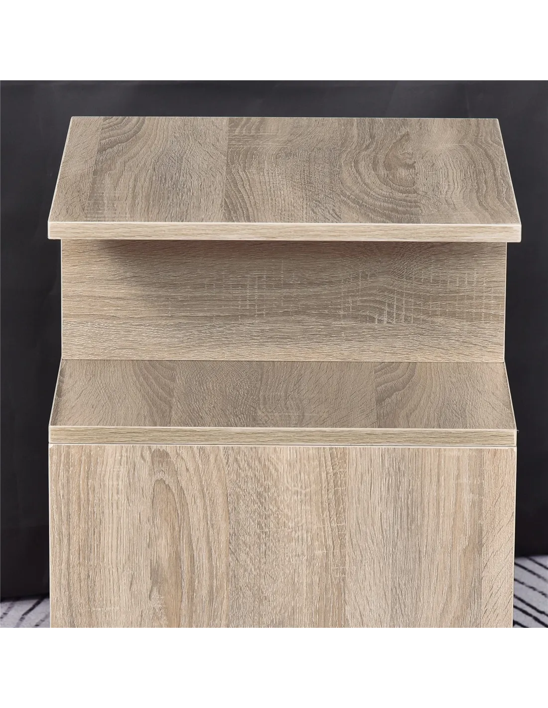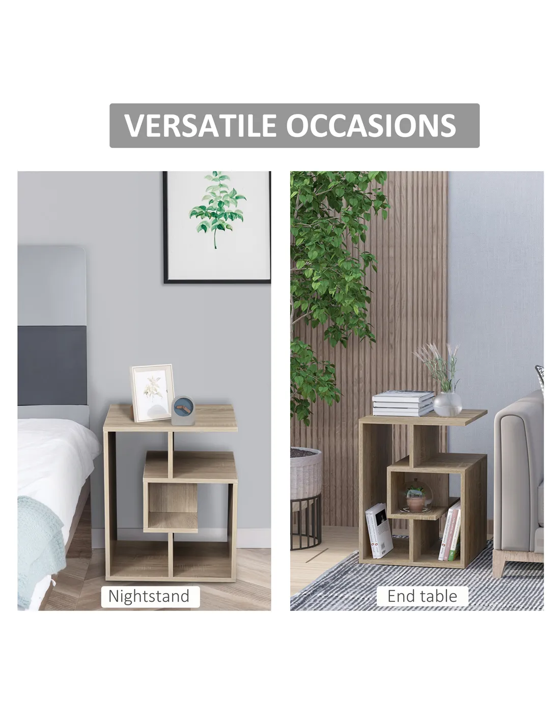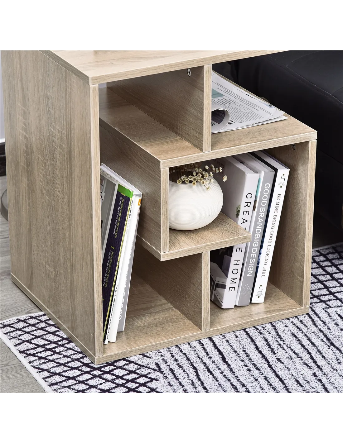 - Thanks to its versatile oak finish and modern cubic design, it complements various interior styles from contemporary to classic.