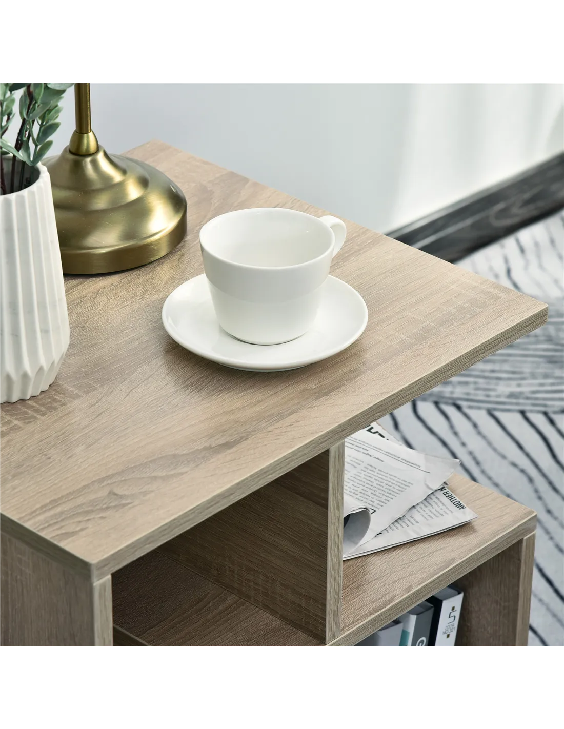 - Three-part storage for magazines, drinks, snacks, vase, remote controls or other home accessories