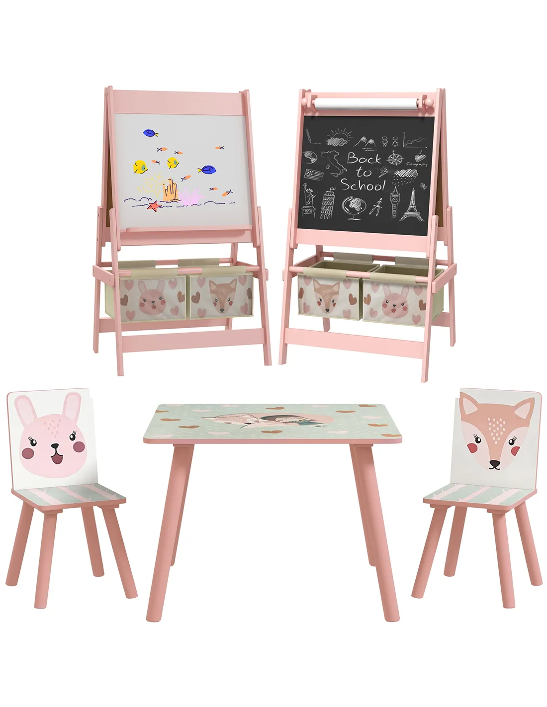 - Four-piece set, including a desk with two matching chairs and a kids easel