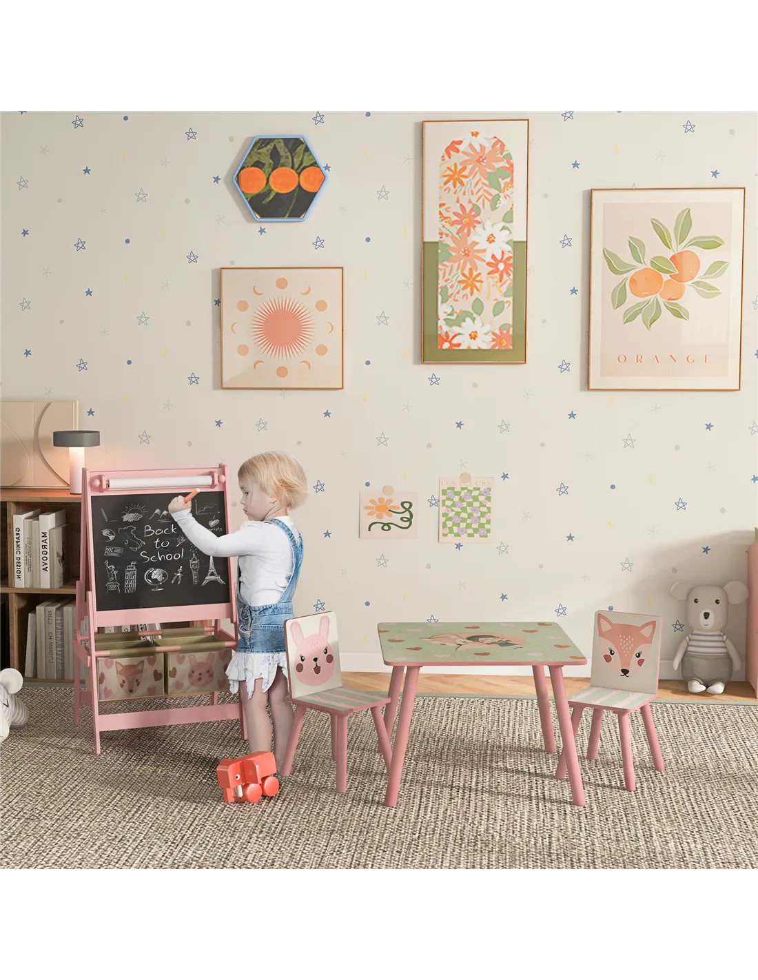 Give your kids the space they need to learn, grow and play and spark their imagination with our ZONEKIZ table and chair set, versatile easel. They can read, study, eat and play by using table & chair set. The kids easel can be used to sketch, doodle or write, which has storage baskets at the bottom, keeping all essentials neatly organised. More than furniture, this series is a haven for development and creating lasting memories.