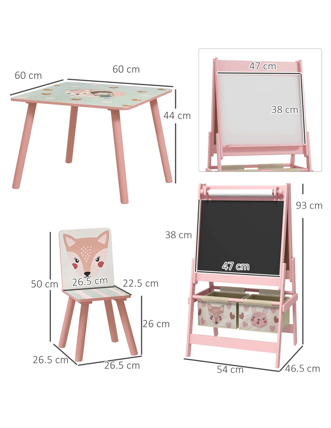 - Dimensions: Table: 44H x 60L x 60Wcm. Chair: 50H x 26.5W x 26.5Dcm. Seat: 26H x 26.5W x 22.5Dcm. Back: 24.5H x 29L x 26Wcm. Easel: 93H x 54W x 46.5Dcm. Board: 38H x 47Wcm. Paper roll width: 35cm. Single basket: 14.5H x 27L x 24Wcm. Off the ground: 17cm