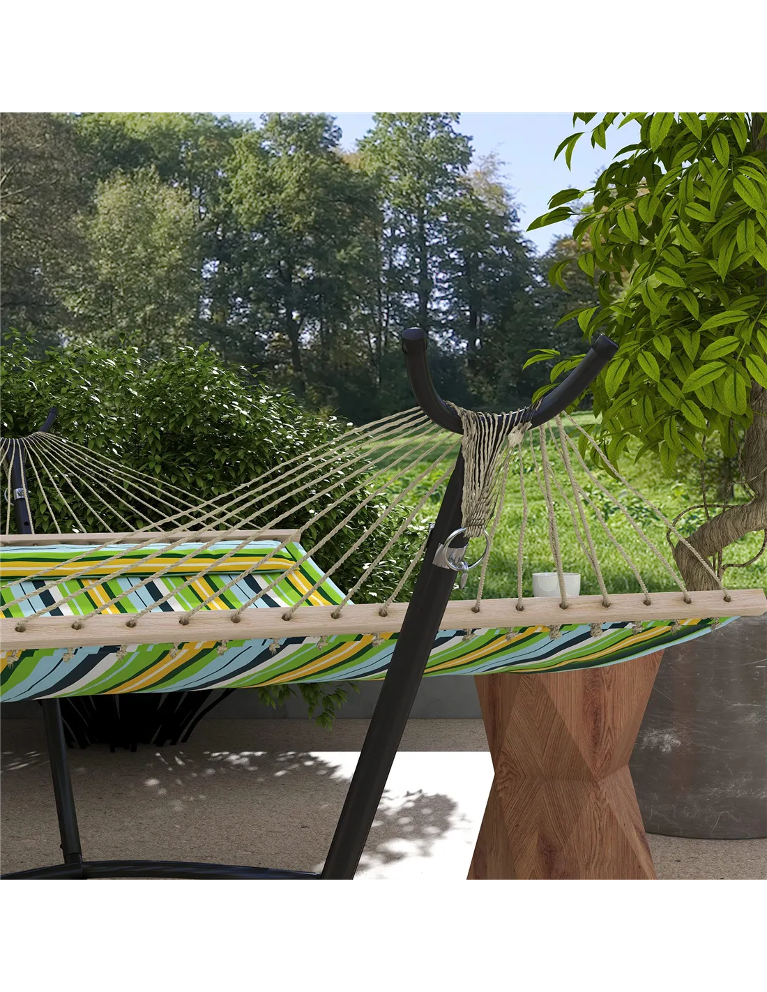 The Outsunny 9.5ft Hammock Stand is a versatile addition to any home or garden, ideal for those who love relaxing outdoors without the need for trees or fixed supports. Perfectly suited for balconies, patios, gardens, or even indoor spaces such as conservatories and living rooms, this stand supports various hammock styles including string, Brazilian, flat, and rope hammocks. Thanks to its adjustable frame and six-position holes, you can easily customise the height and tension to suit your comfort. The built-in wheels and carry bag make it simple to move and store, whether you want to enjoy a sunny afternoon in the garden or unwind indoors on a rainy day. Its robust powder-coated metal frame ensures durability through all seasons, making it a reliable choice for year-round leisure.