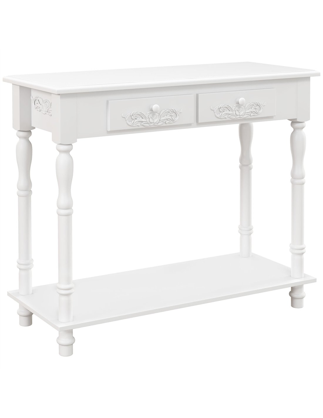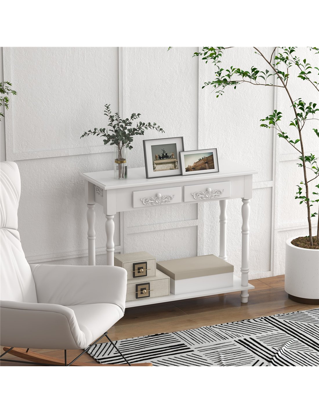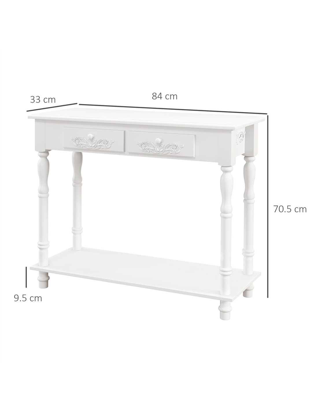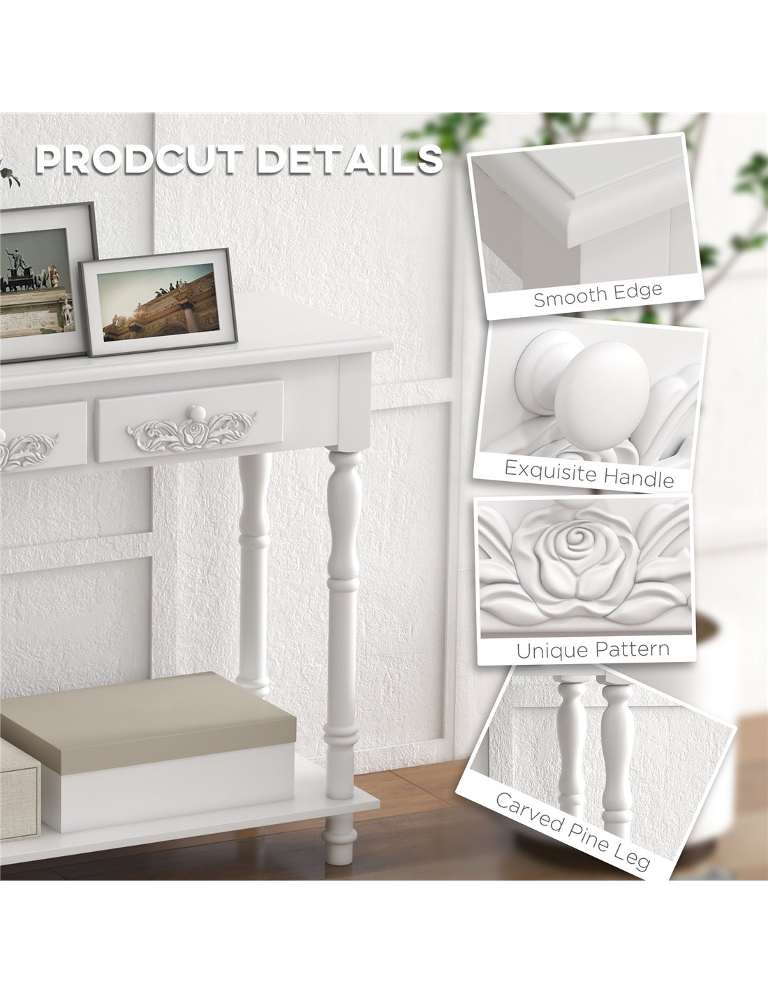The HOMCOM console table is a versatile addition to any home, perfectly suited for various spaces such as living rooms, hallways, bedrooms, or entryways. Its compact yet spacious design allows it to function as a sofa side desk, a stylish storage unit, or a decorative display surface. Place it beside your sofa to hold books, drinks, or a lamp, or use it in your hallway to organise keys, mail, and everyday essentials. The two drawers and open shelf provide practical storage for smaller items, keeping your space tidy and clutter-free. Its elegant white finish and carved pine legs complement both modern and traditional interiors, making it a seamless fit in any décor style.
