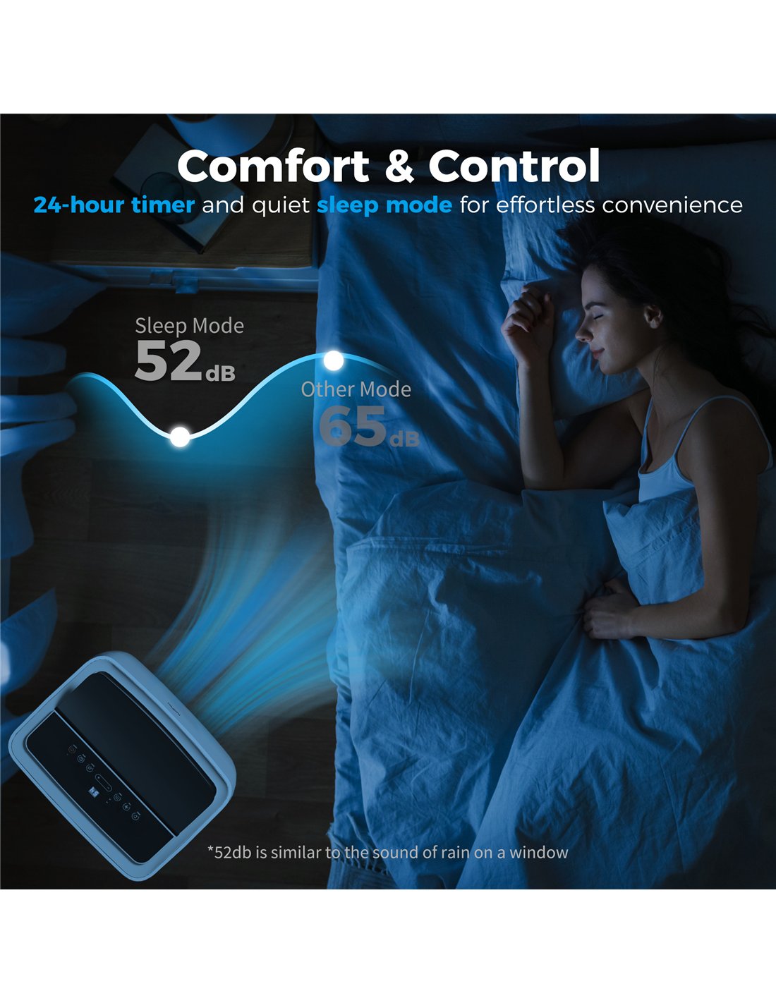 - Two ways to control: via the on-unti panel or with the included remote