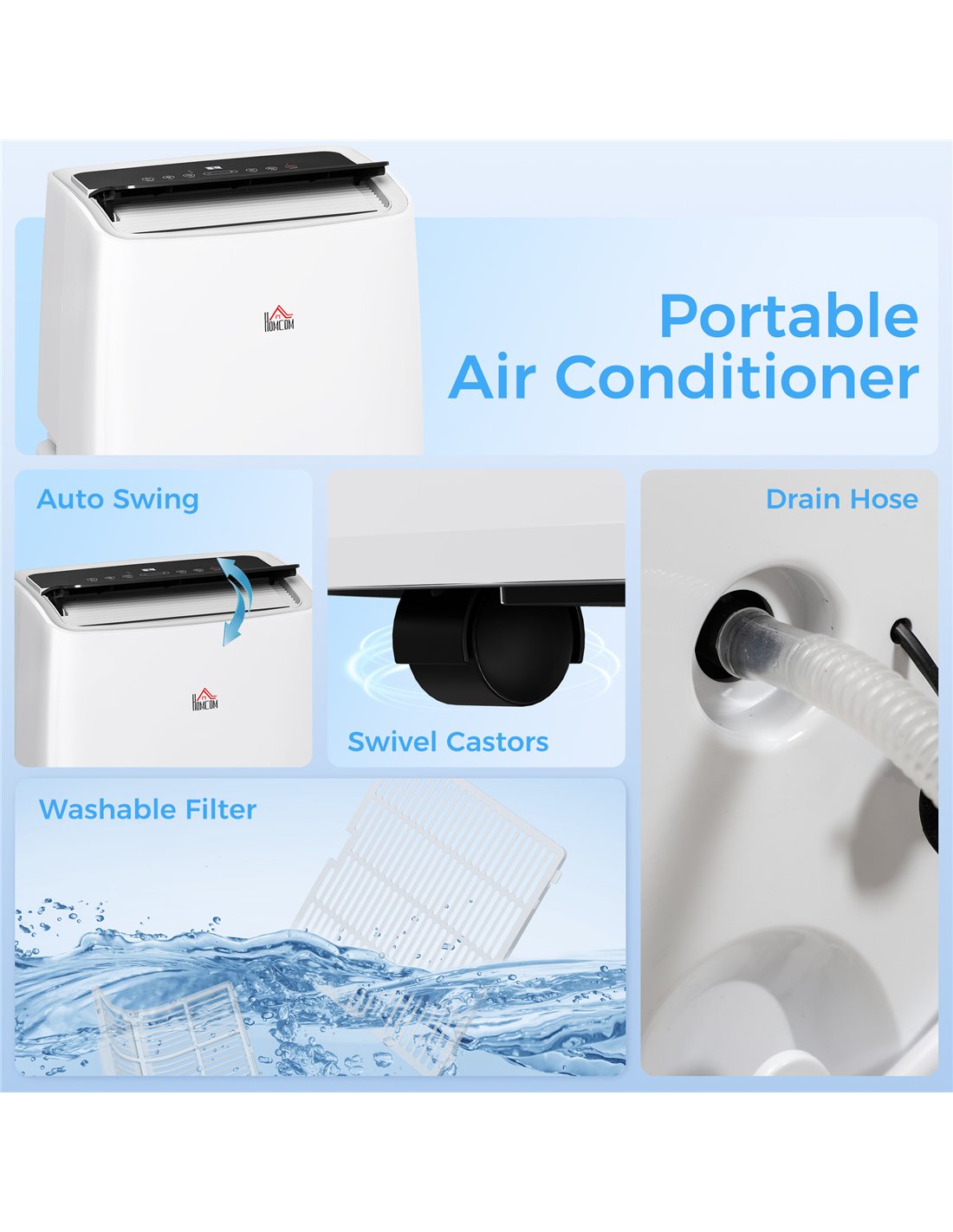 The HOMCOM portable air conditioner is ideal for cooling and dehumidifying rooms up to 40m², making it perfect for bedrooms, living rooms, home offices, or small flats. Thanks to its compact design with four wheels and a handle, it can be effortlessly moved between rooms or stored away when not in use. The adjustable airflow and three fan speeds allow you to tailor the cooling experience to your comfort, while the sleep mode ensures a quiet and restful night. The included window kit and drainage pipe simplify installation on sliding windows, ensuring efficient ventilation without hassle. Families will appreciate the child safety lock, providing peace of mind in busy households.