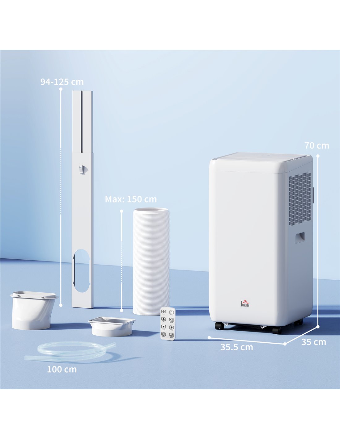 The HOMCOM 12,000 BTU 5-in-1 Mobile Air Conditioner is ideal for cooling living rooms, bedrooms, or home offices up to 35m². Its compact design and smooth-rolling wheels allow effortless relocation between rooms, making it perfect for flats or houses with sliding windows. Use the 'sleep' mode for a quieter environment during the night, or activate 'dehumidify' to reduce humidity on damp days. The adjustable air blades ensure targeted airflow, enhancing comfort whether you’re working, relaxing, or entertaining guests. Thanks to the included window kit and draining pipe, installation is straightforward and hassle-free.