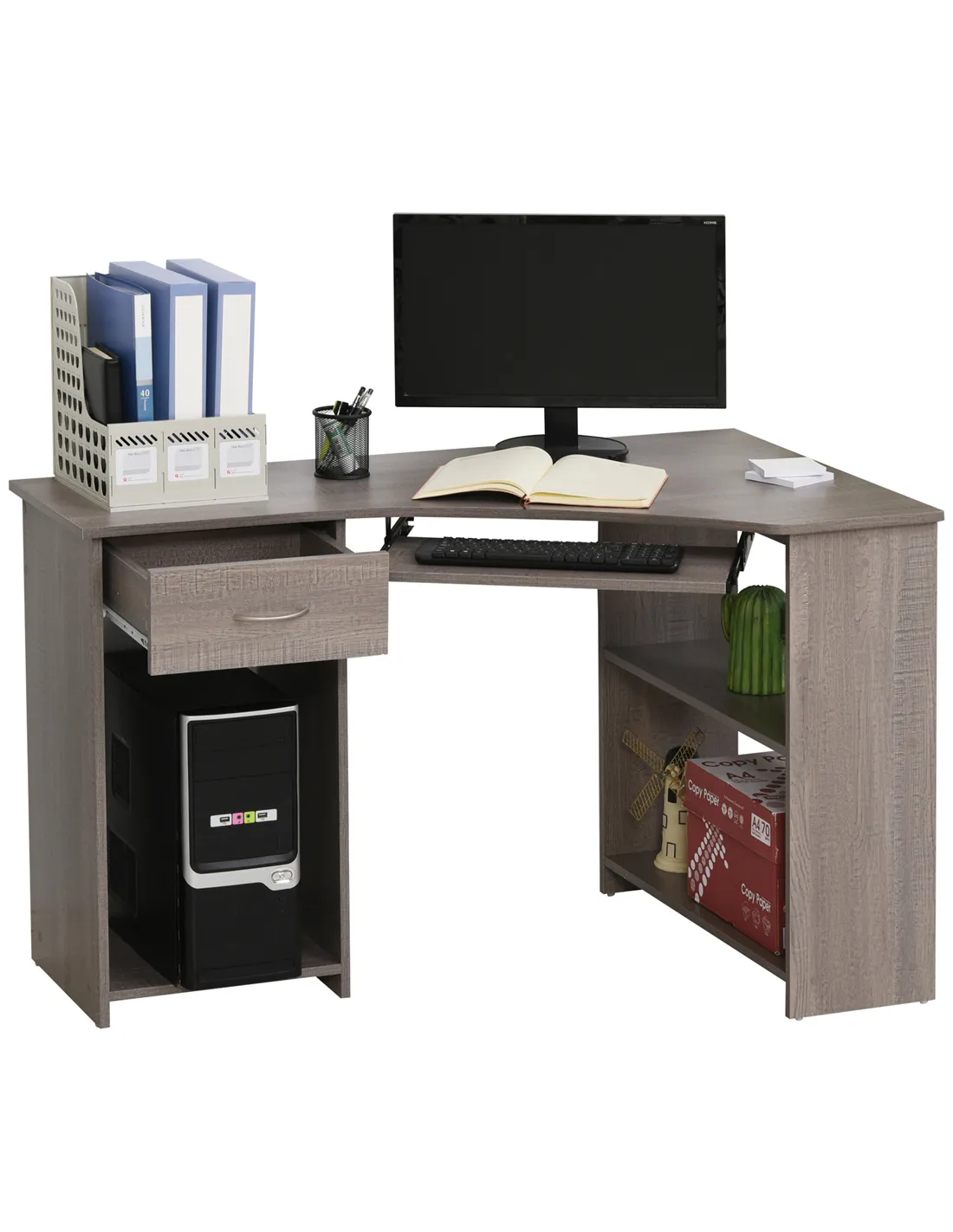 - Great for remote workers requiring organised storage with its keyboard tray, CPU stand, and multiple shelves to keep devices and documents tidy.