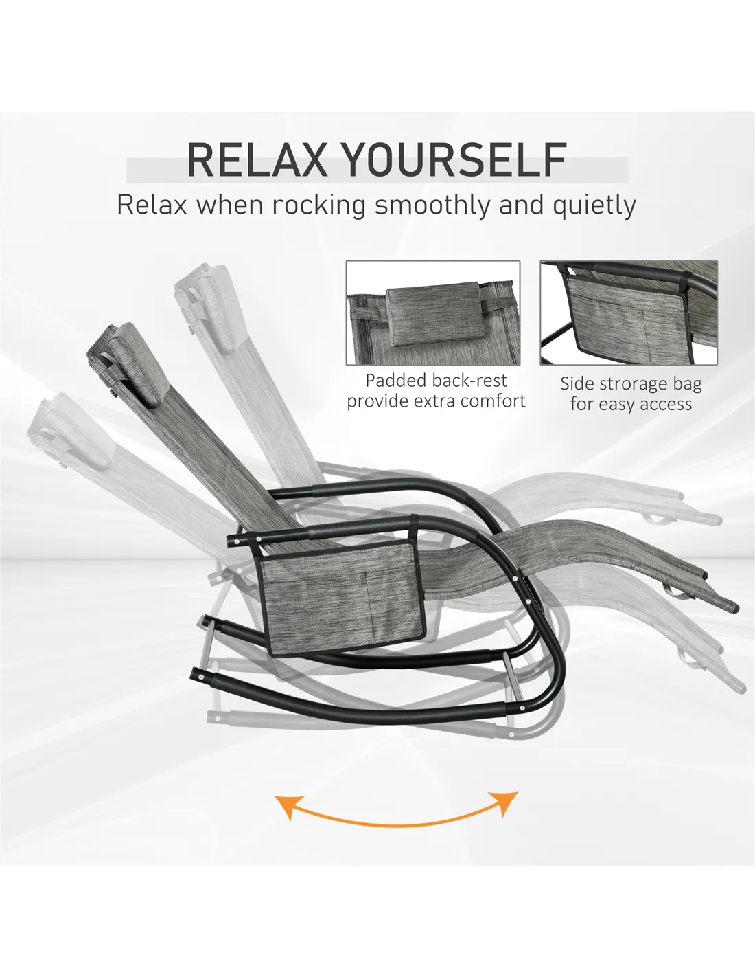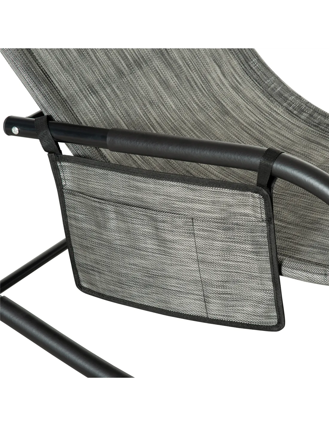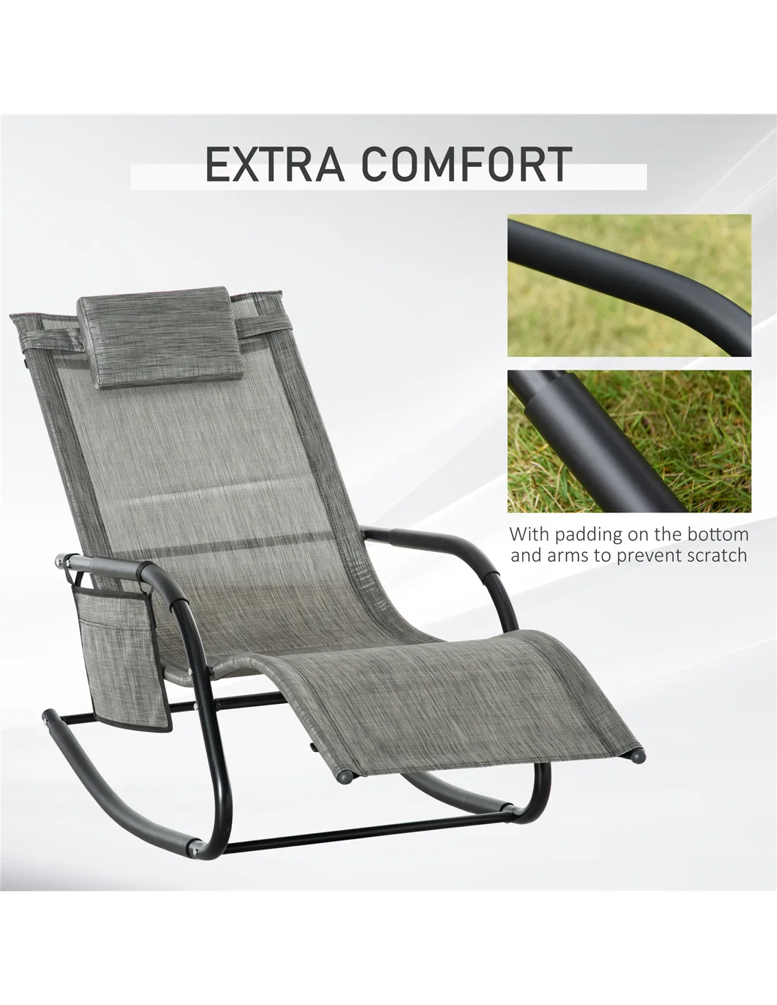 Outsunny Outdoor Garden Rocking Chair, Patio Sun Lounger Rocker Chair with Breathable Mesh Fabric, Removable Headrest Pillow, Armrest, Side Storage Bag, Dark Grey