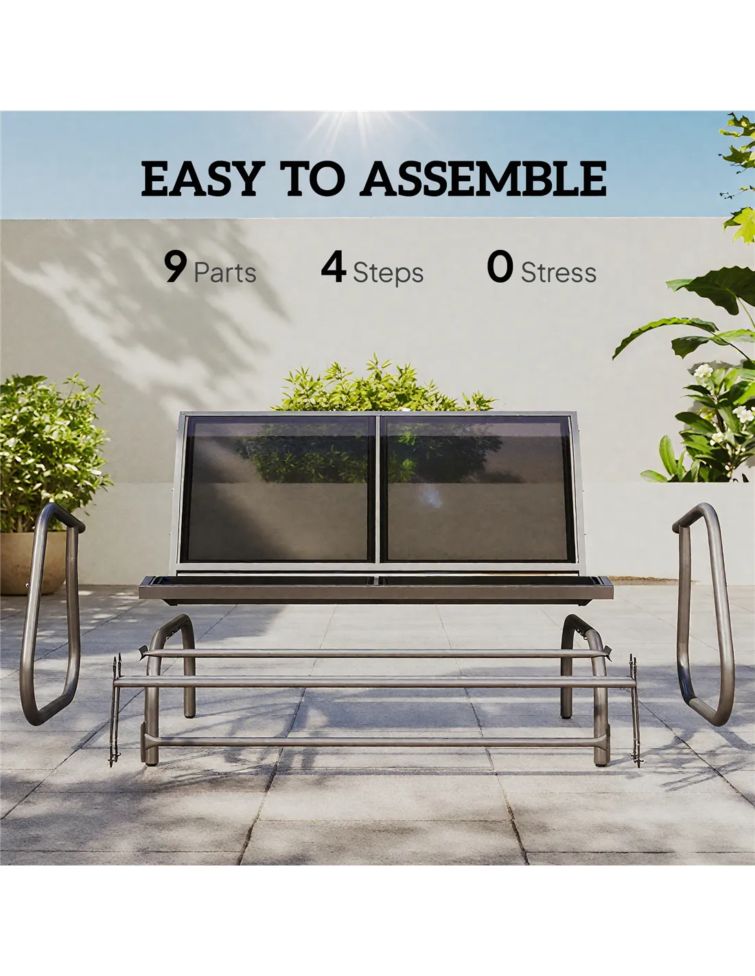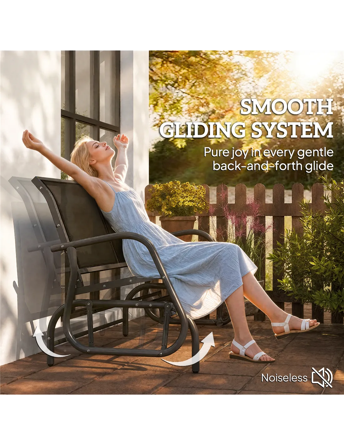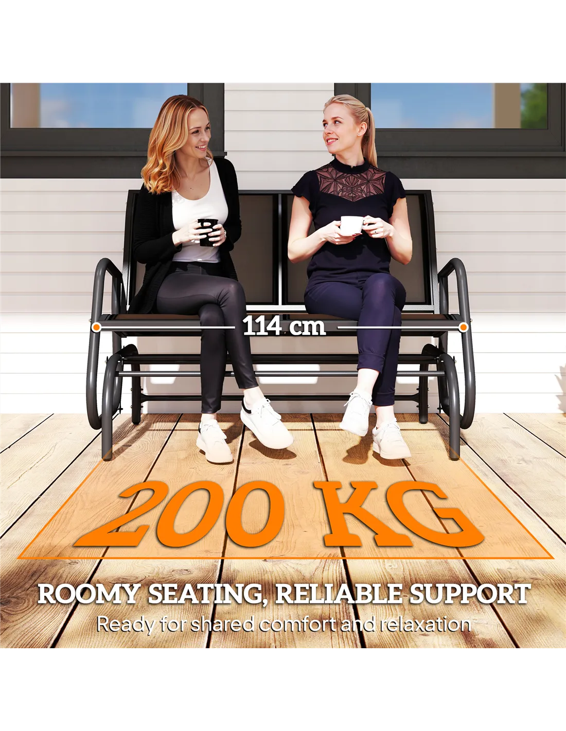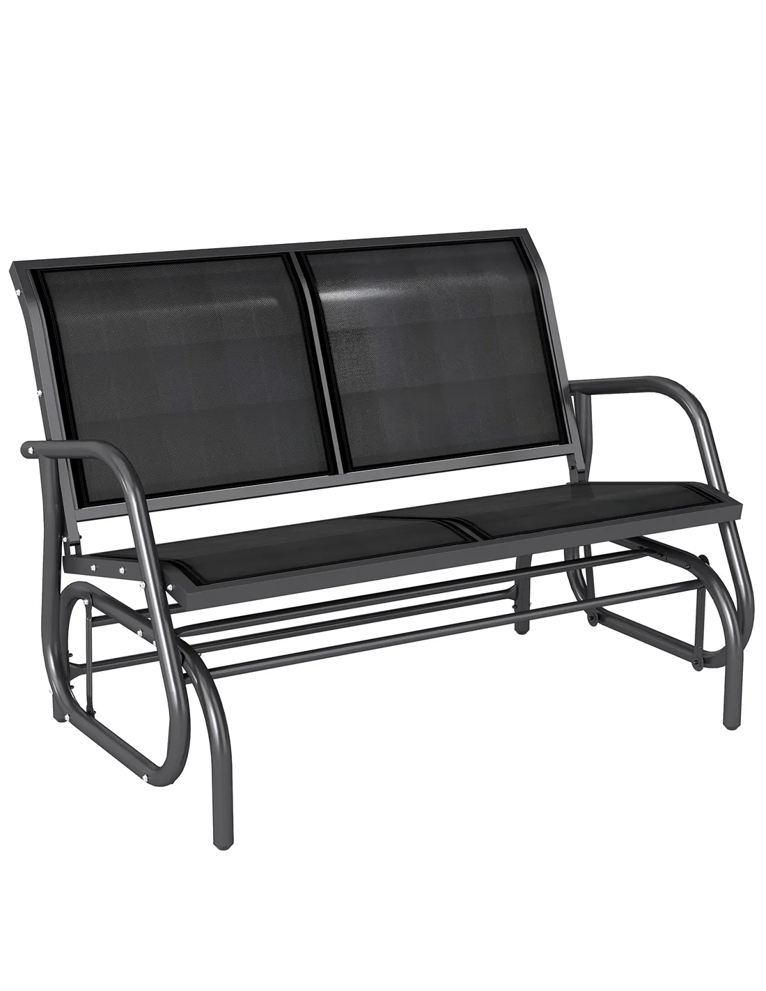 Made of weather-resistant fabric, the mesh seat and backrest of this glider bench keeps you comfortable. The curved and smooth rocker arms support you as you sit. Metal frame of the garden rocker is tough, and it's crafted into a gliding shape for it to move forwards and backwards gently. Enjoy a relaxing day in the sun or shade with our love seats for garden.
