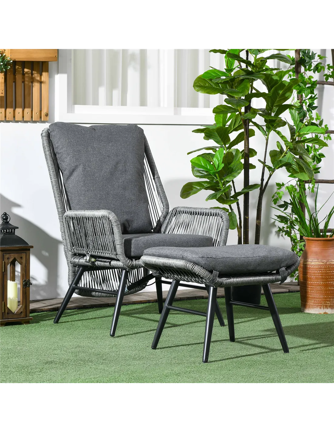 Outsunny String Rattan Armchair and Footstool Set, with Cushions - Grey