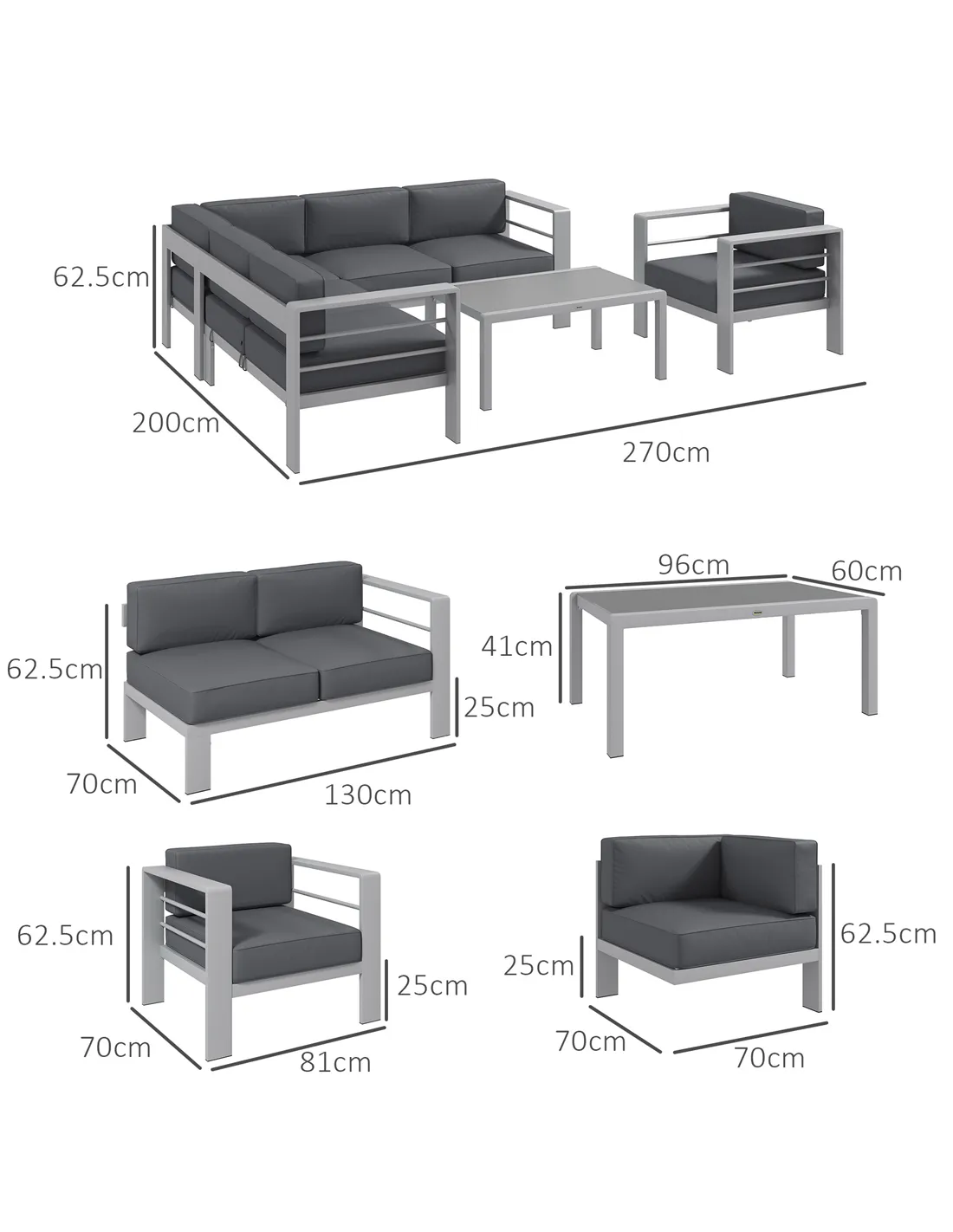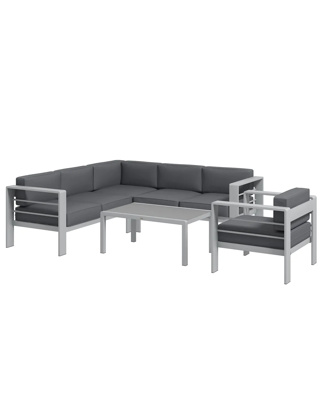 The Outsunny aluminium garden sofa set is perfect for creating a stylish and comfortable outdoor living space in your UK garden, patio, or conservatory. Its modular design allows you to arrange the two-seater sofas, corner chair, and armchair to suit your space and social needs, whether hosting family gatherings or enjoying a quiet afternoon with a book. The tempered glass-top table offers a practical surface for drinks and snacks, making it ideal for alfresco dining or casual entertaining. Thanks to its weather-resistant aluminium frame and plush cushions, this set combines durability with relaxation, enhancing any outdoor area with a modern, minimalistic touch.