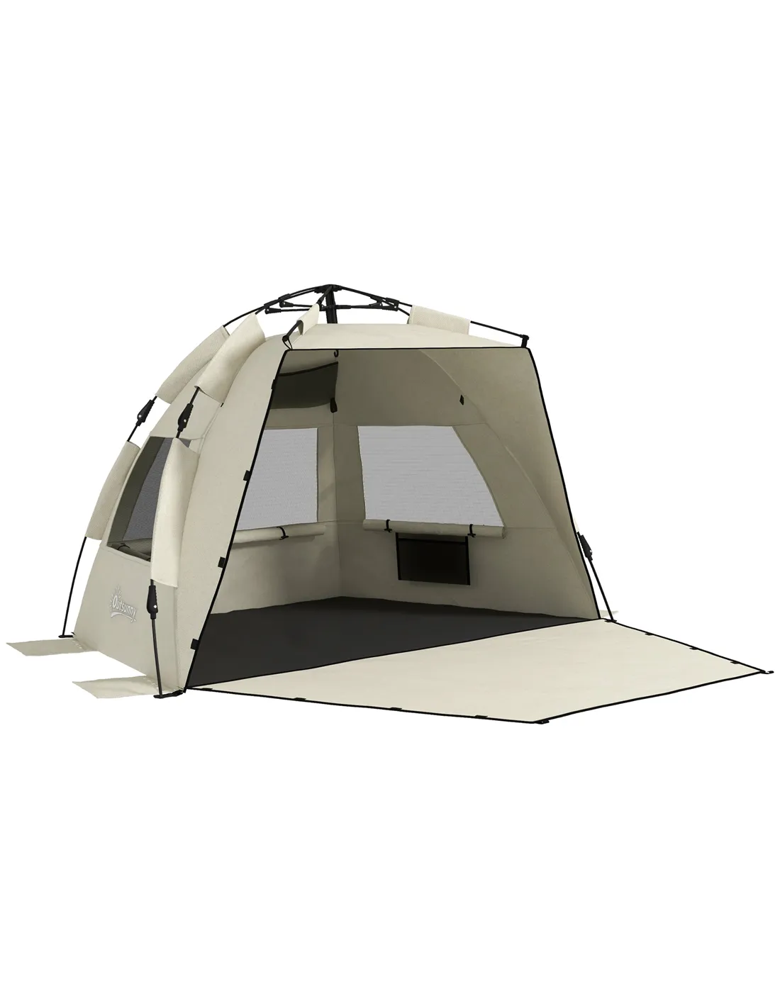 Keep yourself safely protected when at the beach, thanks to this Outsunny pop up beach tent. The design means it'll be up in seconds; it folds back down just as easily. Using fibreglass poles for the core to stay in shape, it's spacious enough to enjoy the sea and sand with a friend. The open front allows you to appreciate beautiful views. Finished with three mesh windows.