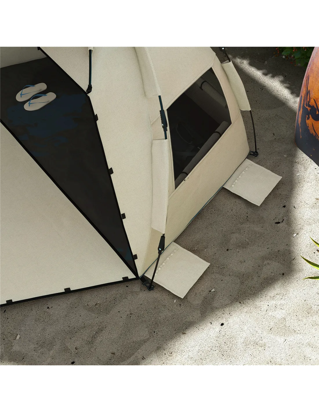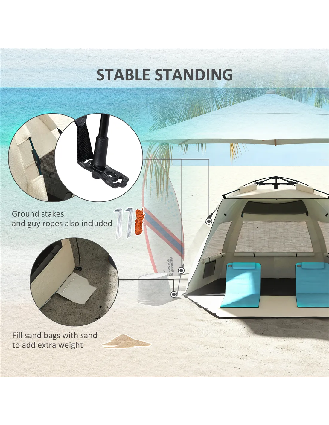 Yes, it comes with eight ground stakes, four guy ropes, and five drawstring sandbags to secure it firmly on various terrains. - Does the tent provide sufficient sun protection?