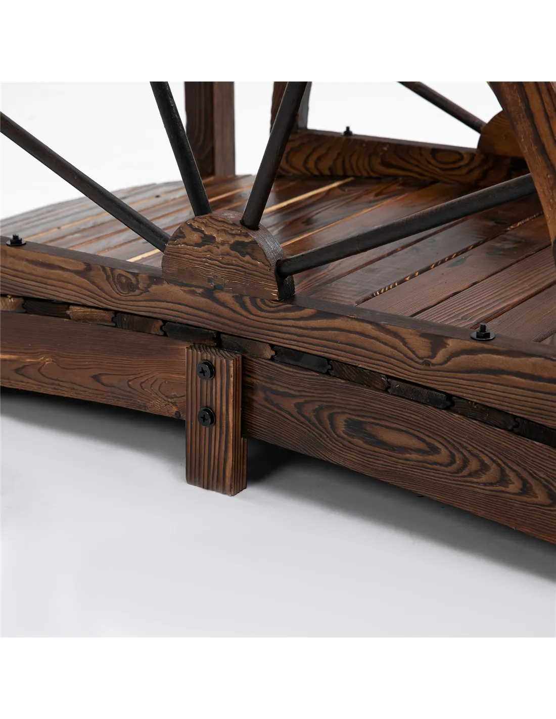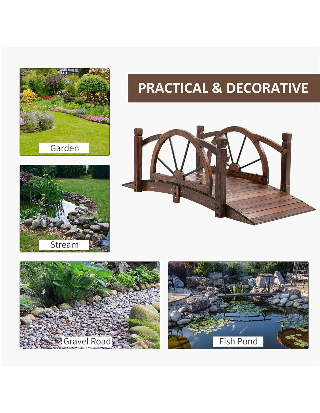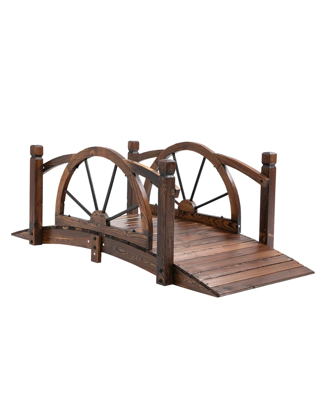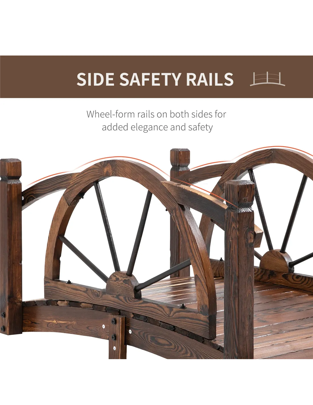 This Outsunny pond bridge adds some beautiful luster to your backyard landscape. Adding a wheel rail design, different from other bridges, makes your backyard unique and provides an excellent view of your ponds, creeks, and gardens. Our garden bridge is made of carbonized fir wood to resist outdoor elements. The arch frame enhances weight capacity and the armrest provide you with great safety when you walk through the bridge.