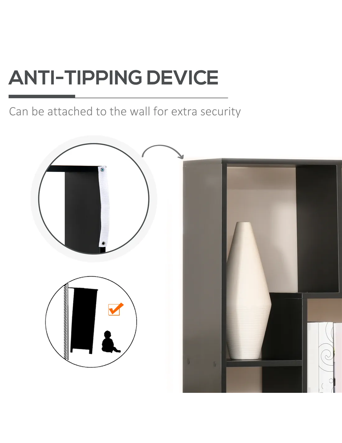 - Anti-tipping design, bookcase back features attachments to secure to the wall – perfect for homes with children and pets