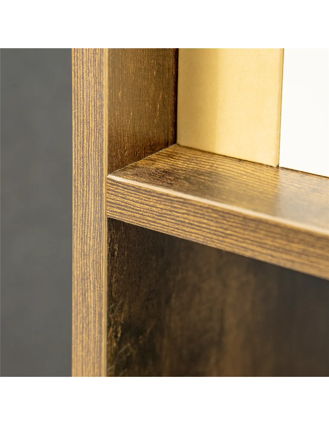 - Subtle wood grain effect surface makes this shelving unit a low-key statement to a variety of decorative setups