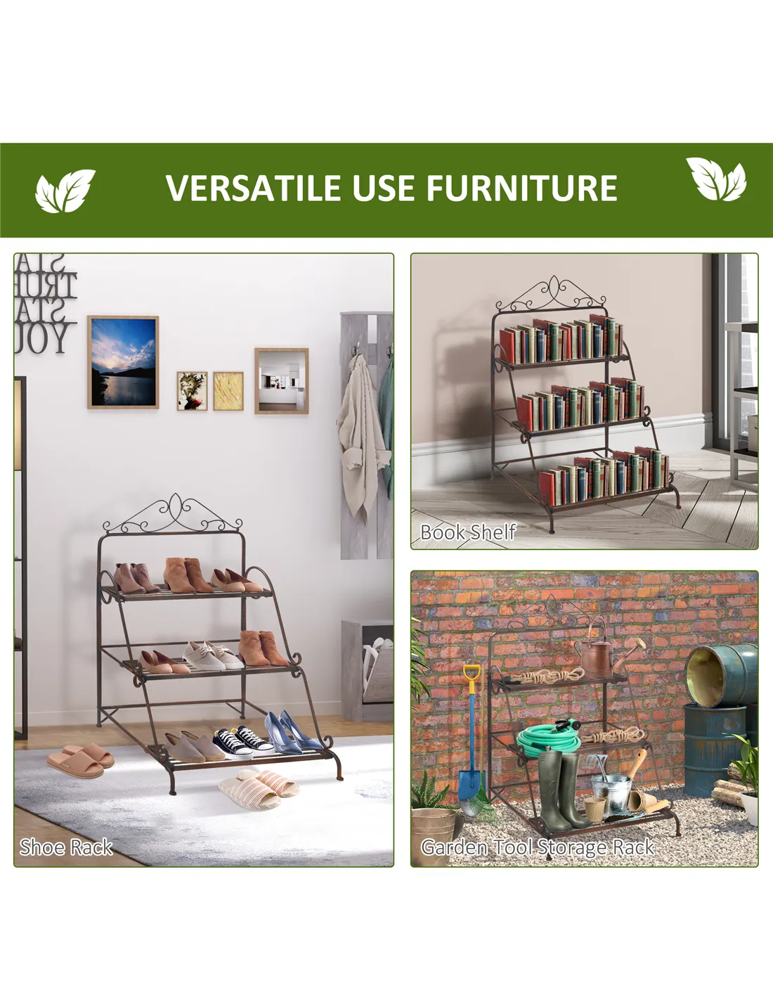Add style and storage to your home with this tall plant stand from Outsunny. Our 3-tiered flower stand is built with a gorgeous sturdy metal scroll work frame, the plant shelf brings a touch of elegance to your porch, patio, indoor space, or wherever you want to utilize it. This tiered plant stand is perfect for holding everything from plants to books to decorative candles. With this corner plant stand, you can easily keep your surrounding area neat, tidy, and stylish!