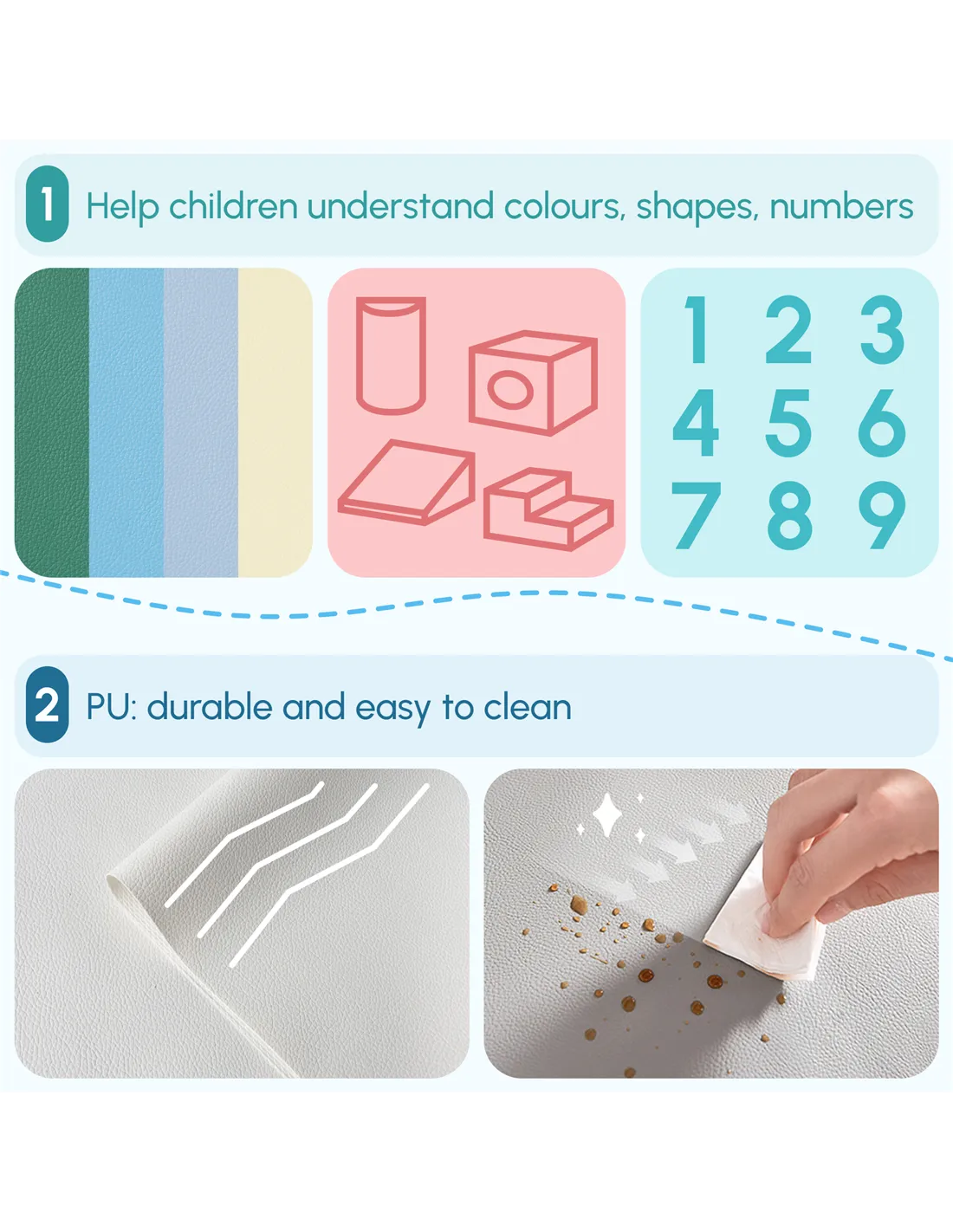 Parents often place the set on carpeted floors or mats to enhance safety and comfort. The easy-to-clean PU surface makes it suitable for busy households, while the lightweight design allows quick rearrangement or storage. This soft play set also complements sensory play activities, helping toddlers explore textures and shapes in a secure setting.