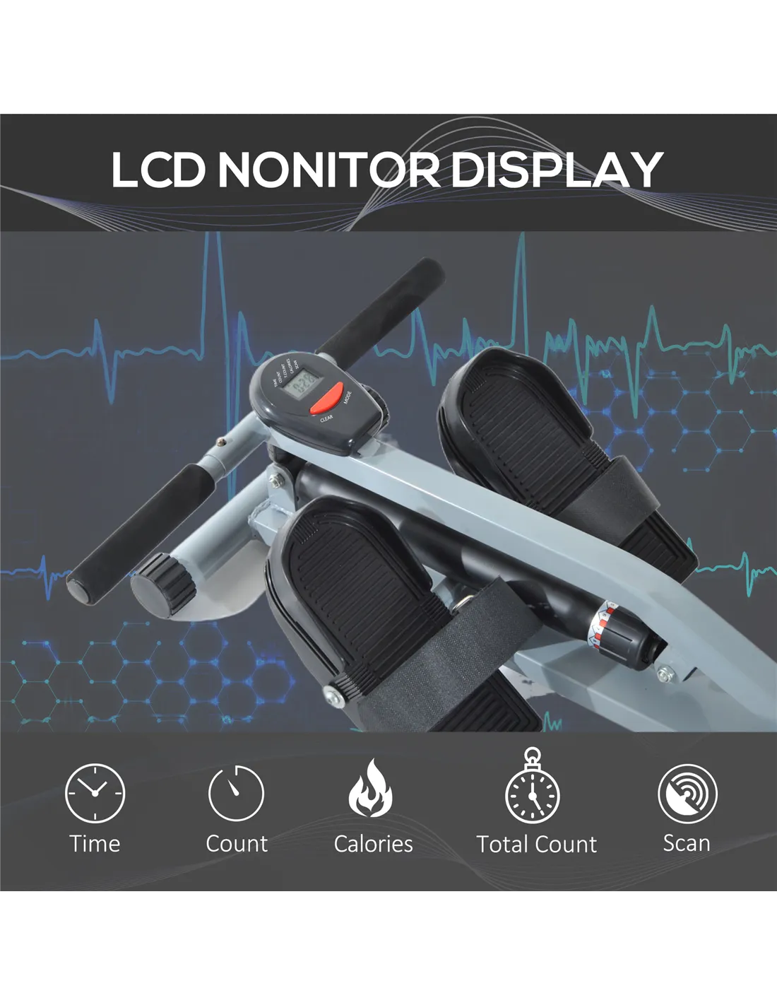 - LCD console displays Time, Count, Calories, Total Count and more