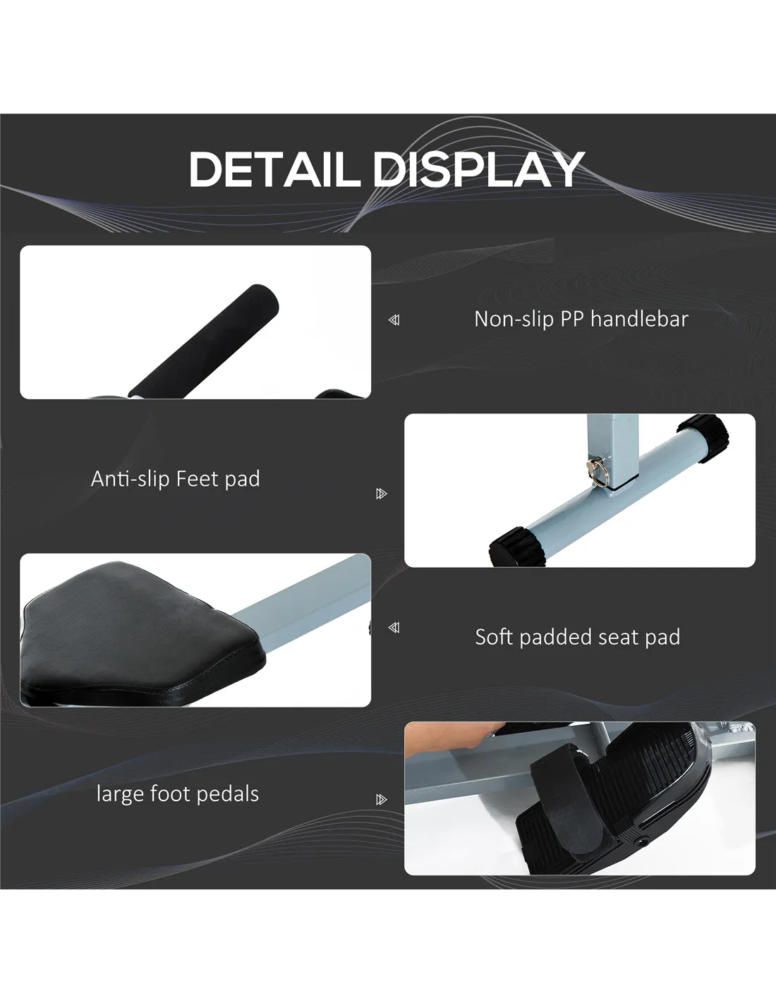 - Large anti-slip foot pedals with adjustable foot straps