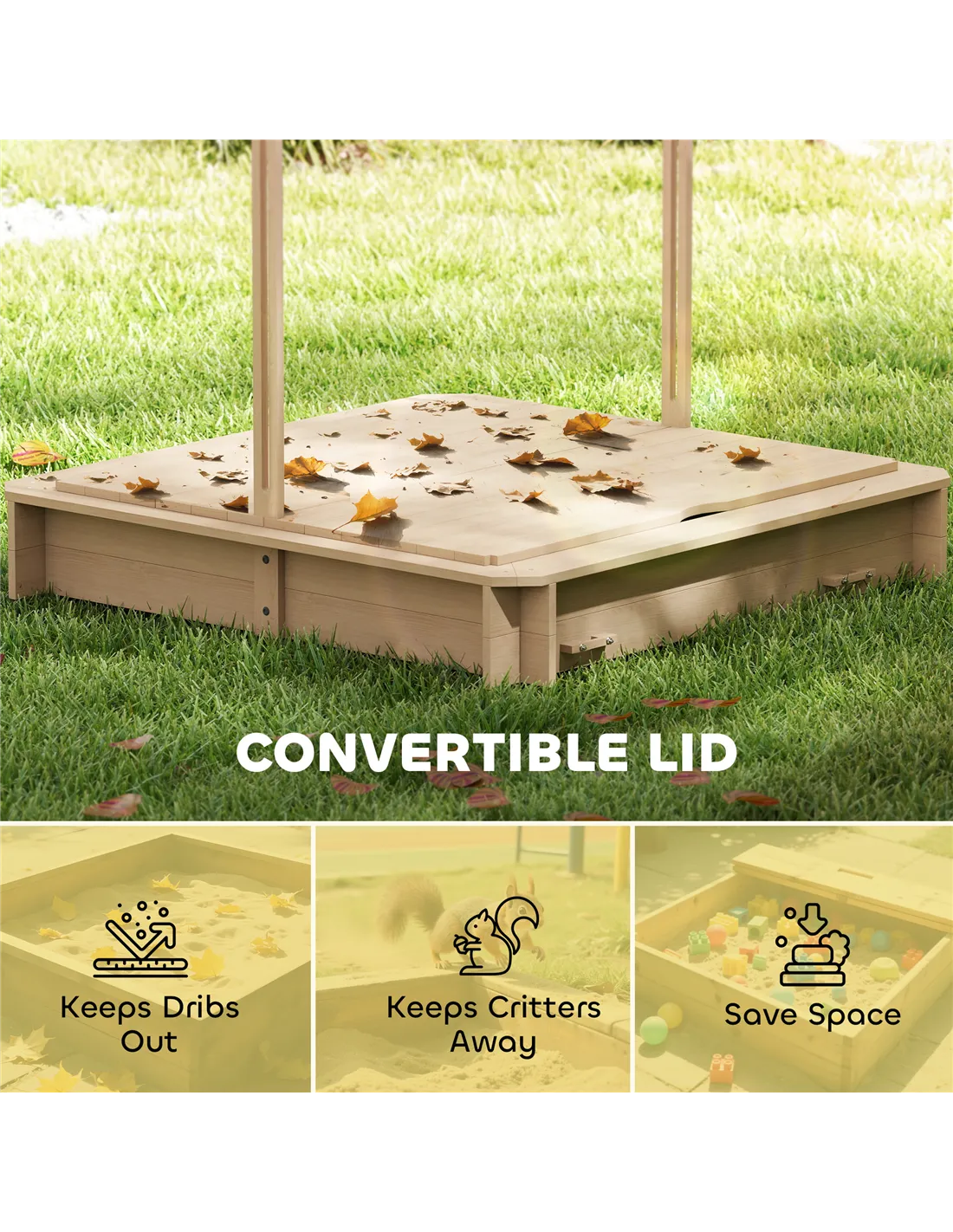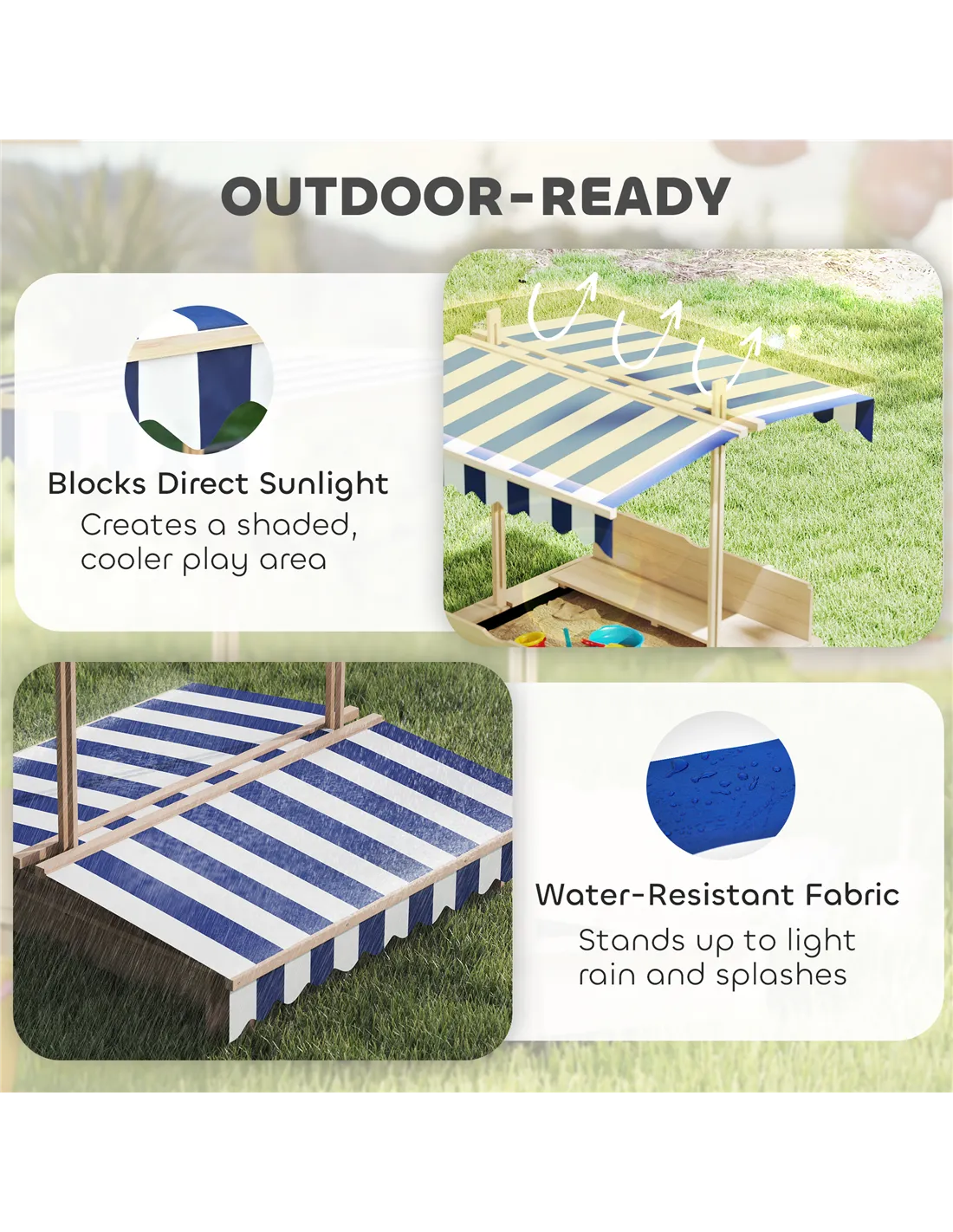 Create a mini beach with the Outsunny kids sandbox! This spacious sandpit, made from solid wood, accommodates multiple children for hours of digging and building. It features comfortable benches on both ends with a sunshade canopy for protection. When playtime is over, collapse the backrests to cover the sand, keeping it safe from rain, debris and animals. Get ready for endless outdoor fun!