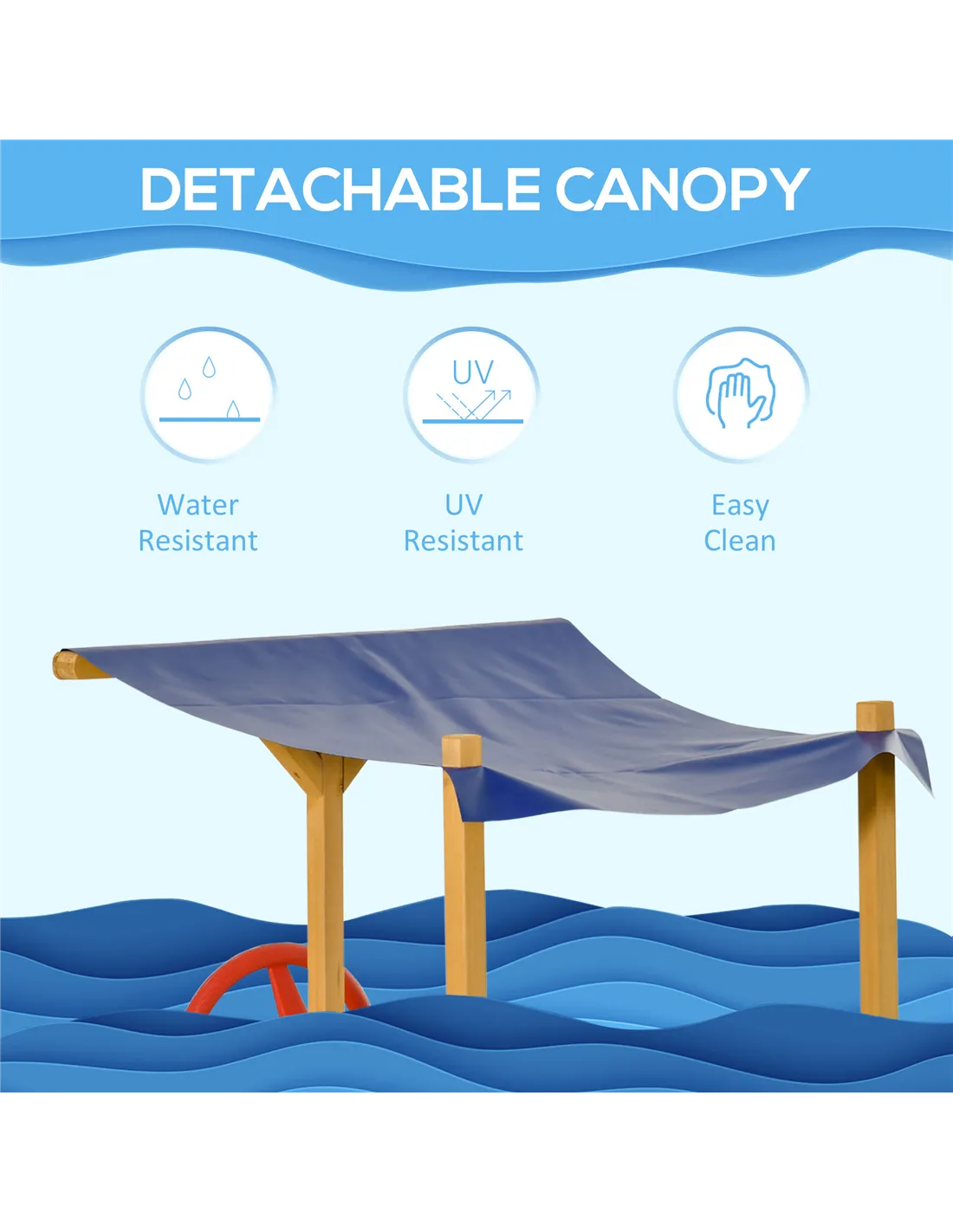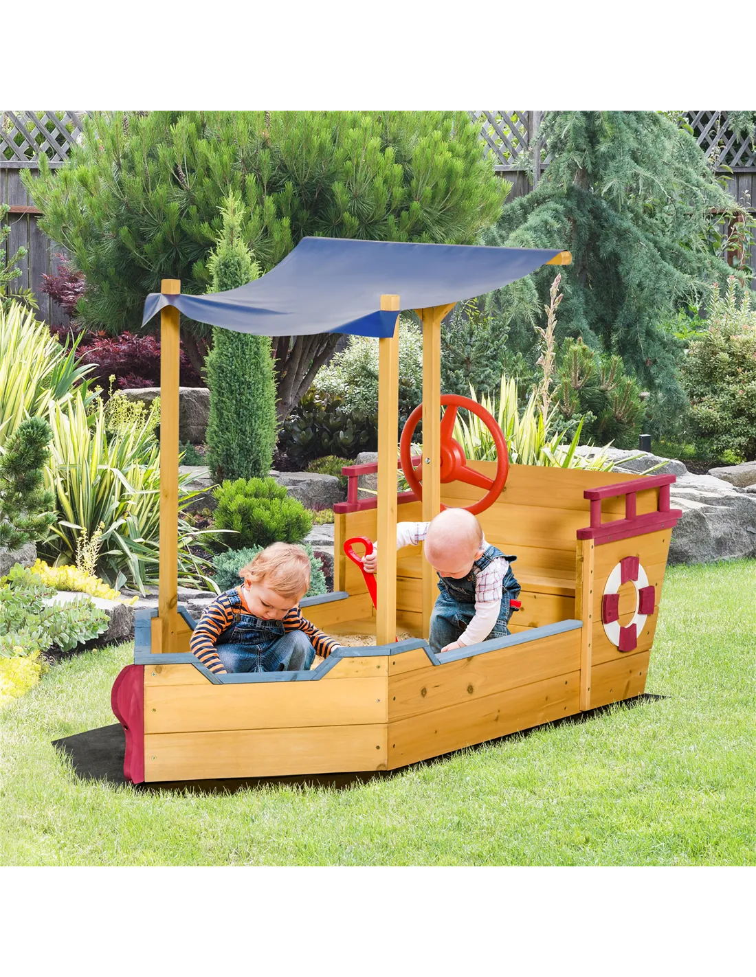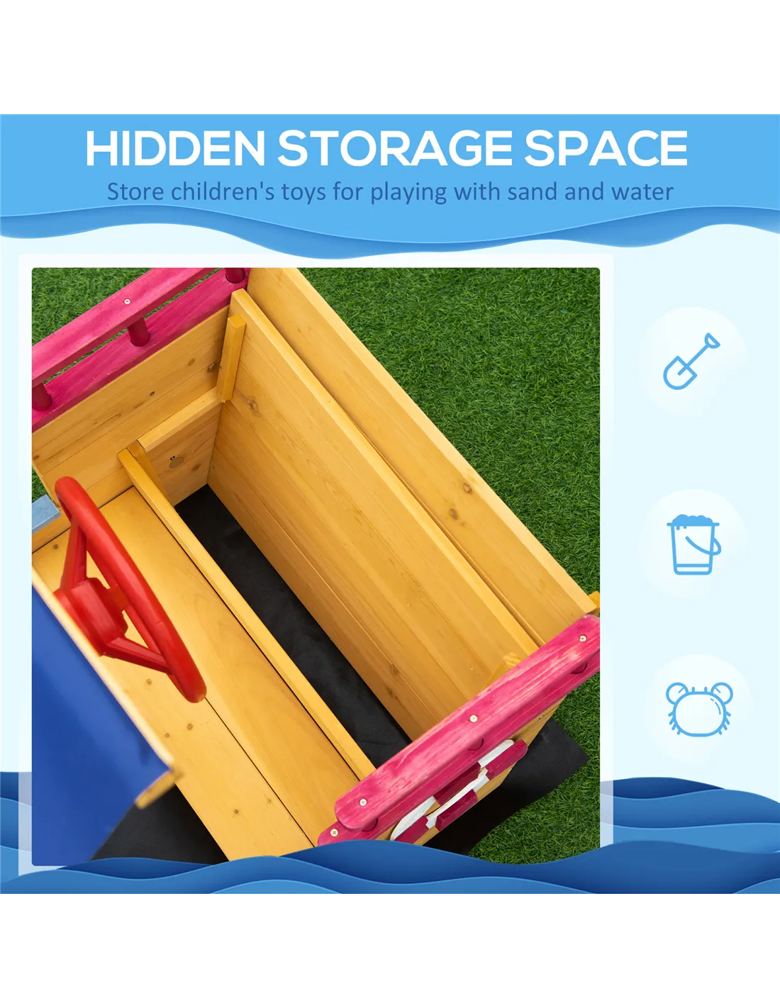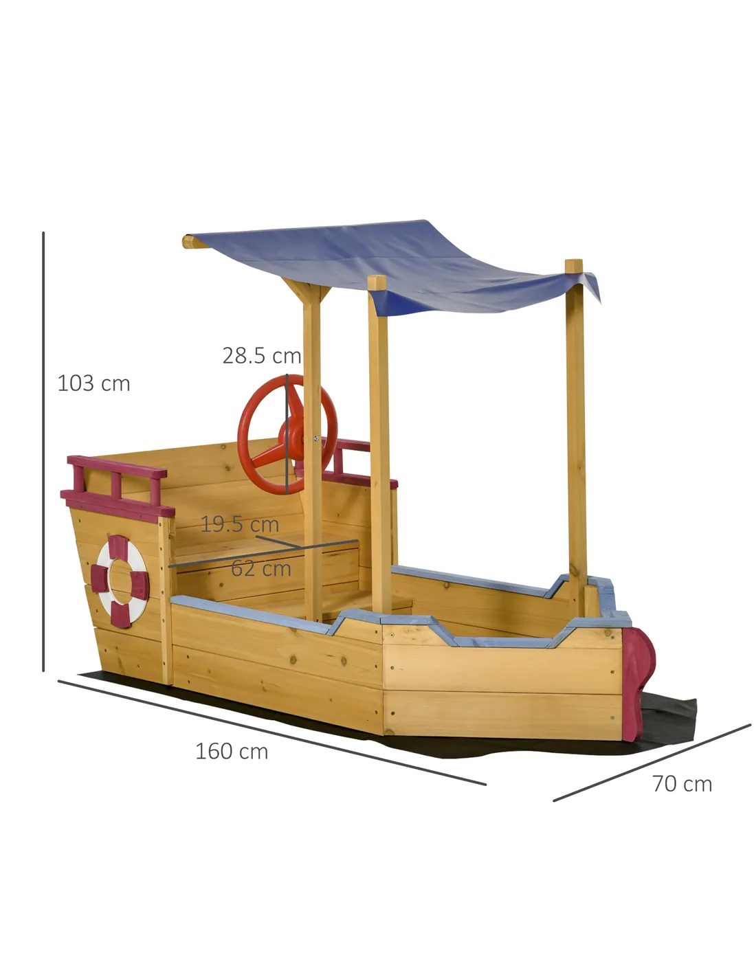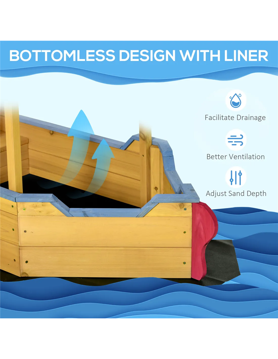 Outsunny Kids Wooden Sand Pit Children Sandbox Pirate Ship Sandboat Play Station for Outdoor w/ Canopy Shade Storage Bench Bottom Liner