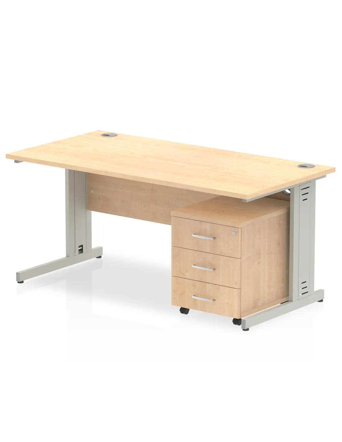 - The desk features a heat-resistant maple melamine finish on a 25mm thick MFC top, combining durability with an attractive appearance. Silver-coated double strut legs with cable management add a modern touch, while the 18mm modesty panel offers privacy and additional structural support.