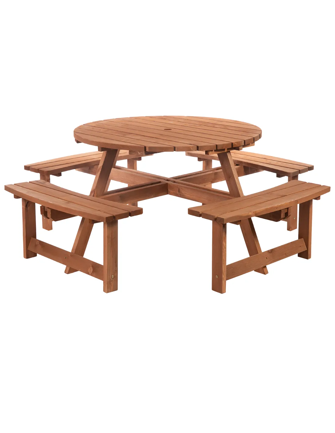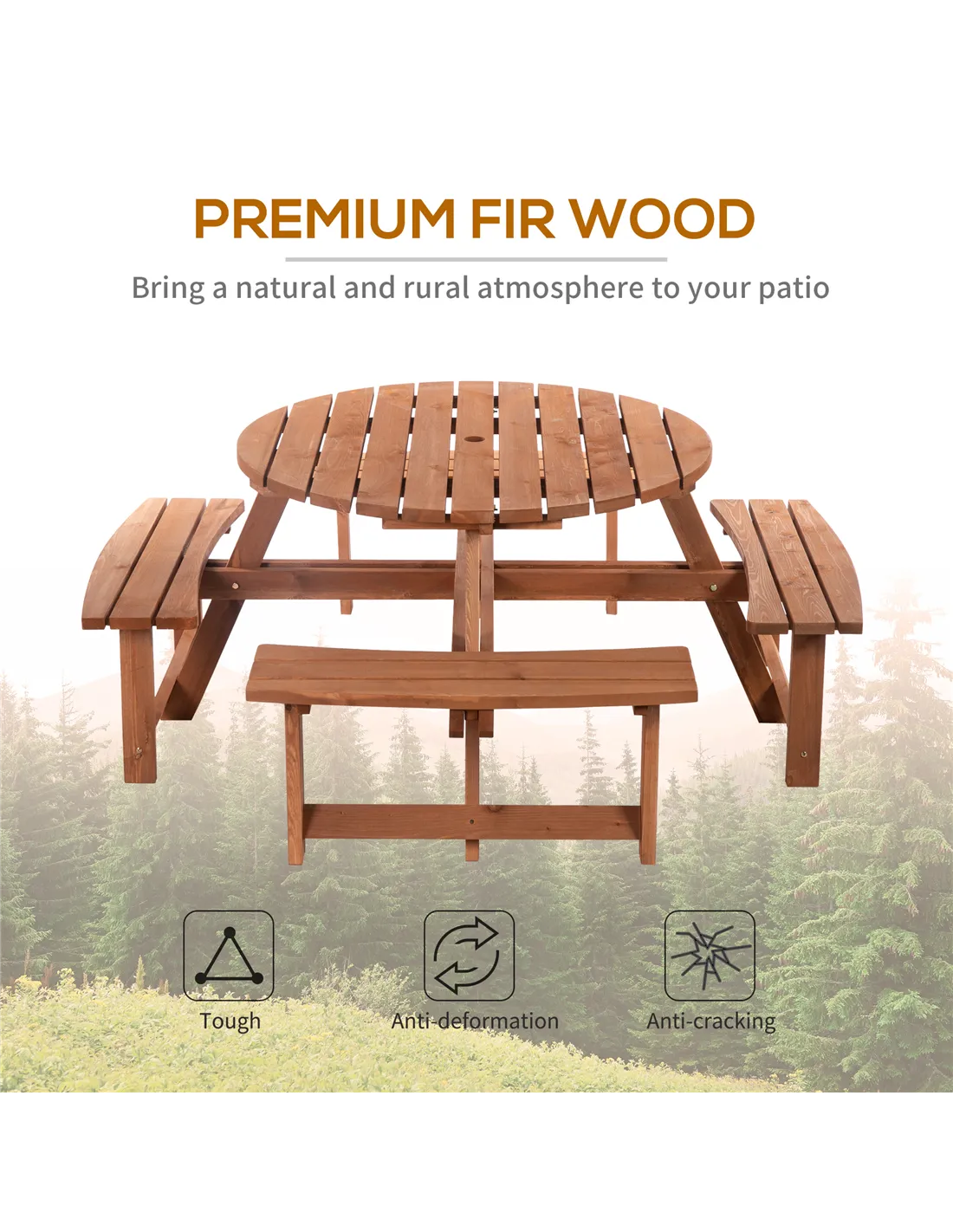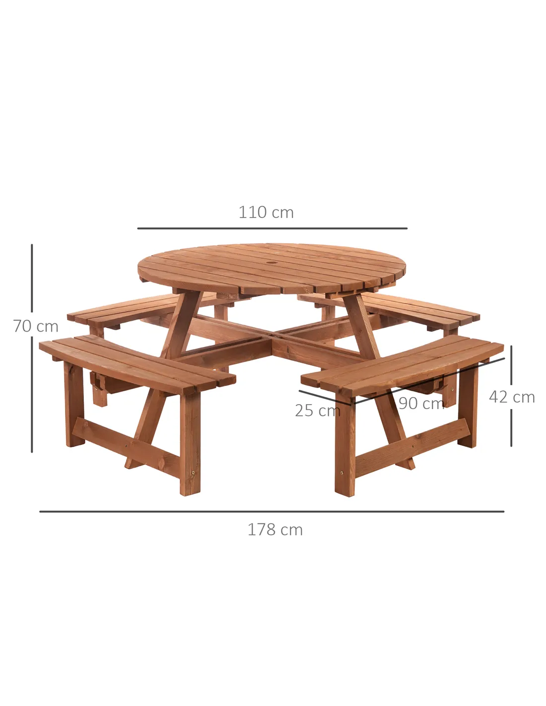 The Outsunny 8-Seater Wooden Picnic Set crafted from durable fir wood is perfect for a variety of outdoor occasions. Whether hosting a family barbecue, enjoying a sunny afternoon tea in your garden, or gathering friends for an al fresco meal, this circular bench set comfortably seats eight, encouraging social interaction and easy movement. Its central parasol hole allows for shade options during warmer months, making it ideal for summer dining or relaxing in the shade. The robust construction and smooth finish also make it suitable for use on patios, terraces, or in parks, blending seamlessly with natural surroundings and enhancing any outdoor living space.
