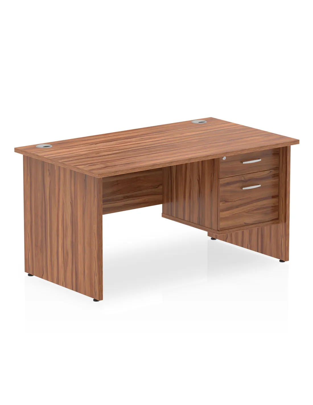 - This versatile desk is perfect for home offices, corporate workspaces, and study areas. Its straight walnut top and fixed pedestal with two drawers offer a practical solution for organising documents and office essentials, making it suitable for professionals and remote workers alike.