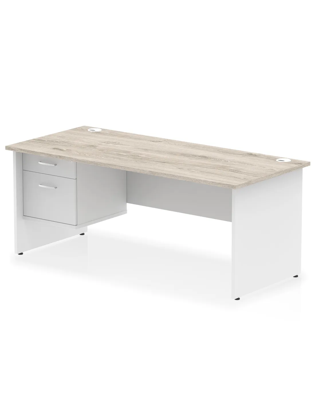 - This versatile desk is perfect for home offices, corporate workspaces, and study areas. Its spacious 1800mm by 800mm surface with a durable grey oak finish complements modern interiors, while the fixed pedestal with two drawers offers practical storage for documents and stationery. According to customer feedback, it integrates seamlessly into both professional and domestic environments, enhancing productivity and organisation.